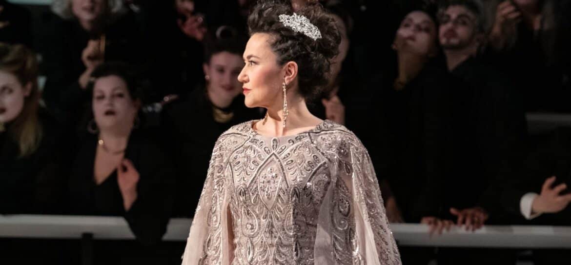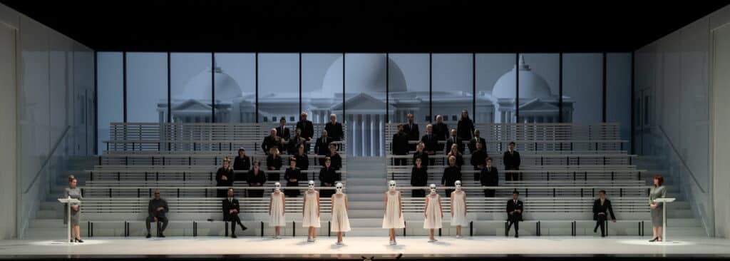 Dès le Prologue, Dominique Pitoiset fait le choix de transposer Armide dans un futur de science-fiction qui est celui des grandes sagas d’anticipation qui encombrent régulièrement nos écrans de cinéma. A l’image de l’épopée Star Wars composée de trois trilogies découpées chacune en trois épisodes, Armide n’est plus structurée en actes mais en épisodes annoncés et résumés par des projections sur le rideau de scène. Le Prologue commence dans l’immense amphithéâtre d’un totalitarisme du futur : aux pupitres de cette enceinte politique se succèdent la Gloire et la Sagesse, executive women à la silhouette sévère et élégante, pour débattre de la stratégie à adopter afin d’assurer l’ordre pacifique dans tout l’univers. Dans cette dictature glaçante, les femmes ont voix au chapitre mais ce sont bien les hommes qui décident et lorsqu’Armide surgit pour la première fois sur scène, sortie des entrailles du sol, elle apparait d’abord comme une espionne dévouée au régime et prête à accepter la mission d’arrêter Renaud qui compromet la sécurité de l’univers. À genoux et prostrée, vêtue d’une simple nuisette, elle n’est qu’un instrument par lequel Hidraot, patriarche bancal à la vue basse, entend conserver son pouvoir.