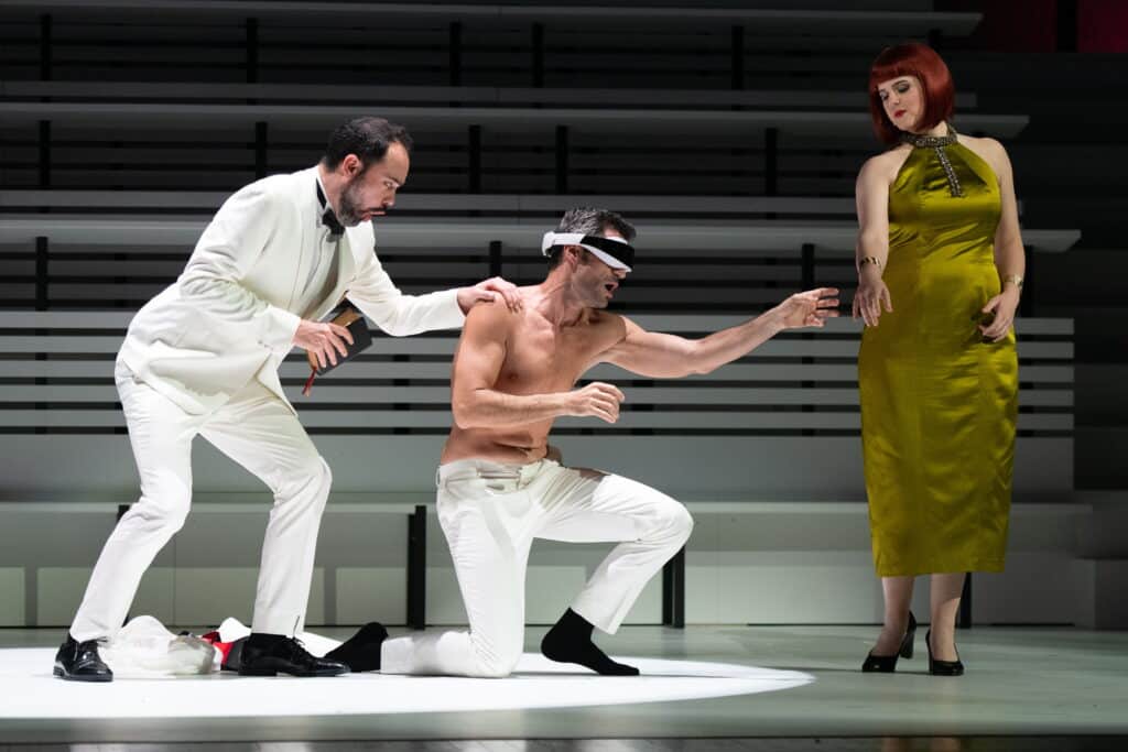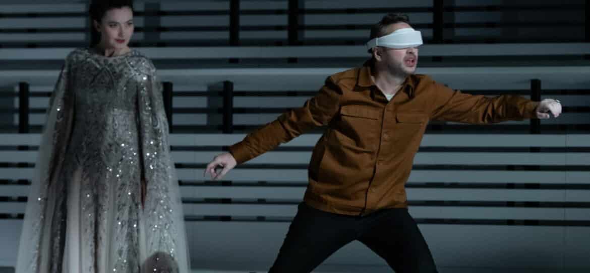 C’est à partir du deuxième « épisode » que le grand décor de gradins immaculés devient encombrant et que la mise en scène se disperse. Les efforts de Dominique Pitoiset pour meubler ce grand amphithéâtre sont vains : les apparitions d’une table d’opération (??), d’un canapé-lit et de deux fauteuils de designer ne sont que des pis-aller. Au moins réussit-on à comprendre qu’Armide et Renaud sont devenus les prisonniers d’un confort bourgeois avec vue sur un paysage désertique tout droit tiré du blockbuster Dune : tandis que Madame est passée chez le caviste et la fleuriste pour apprêter l’appartement et préparer un dîner romantique, Monsieur paresse au milieu des coussins, allongé sur le canapé-lit, l’esprit « matrixé » et uniquement préoccupé d’enchainer les vidéos insipides qui défilent virtuellement devant ses yeux. C’est cet enkystement du sentiment amoureux dans la routine qui provoque la colère d’Armide et son appel à la Haine.