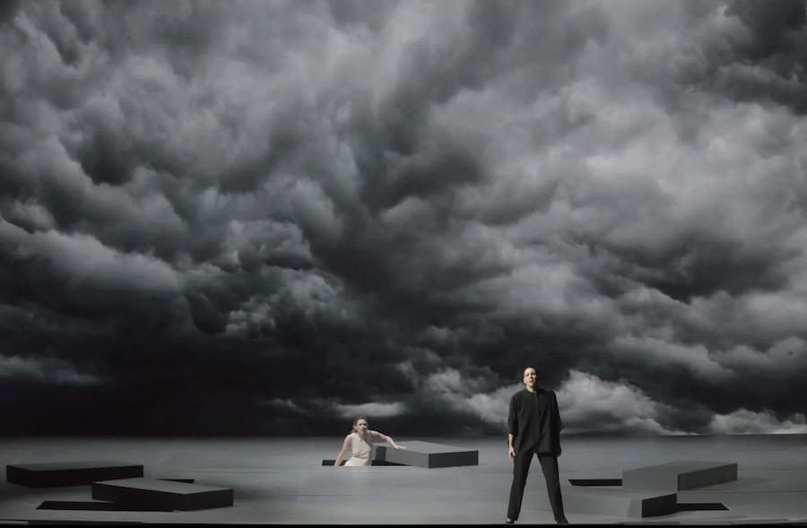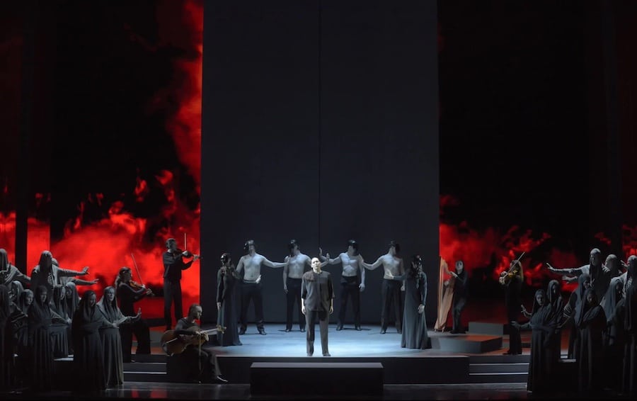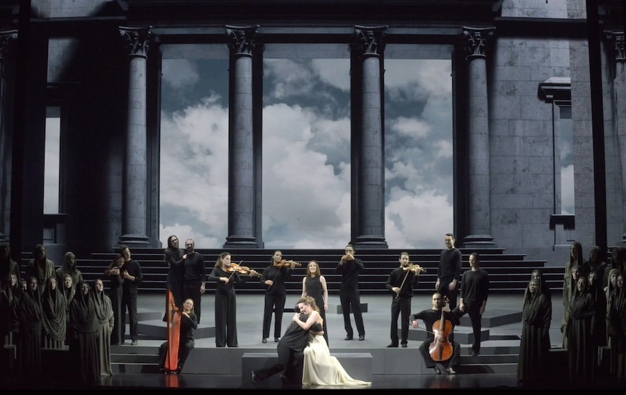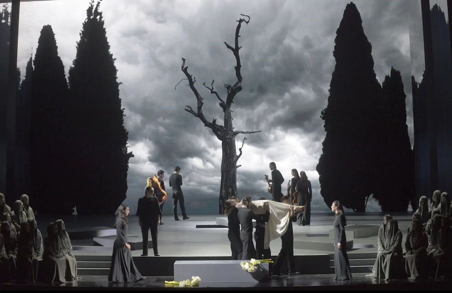 Une synthèse non seulement sonore mais aussi visuelle, comme le donne à voir la mise en scène épurée de Pier Luigi Pizzi, le doyen des scénographes italiens qui ajoute cette énième expérience à sa fréquentation du théâtre gluckiste. Sur scène, nous voyons des pierres tombales qui rappellent les visions de cimetières de la poésie préromantique de Thomas Gray (Elegy Written in a Country Churchyard), Robert Blair (The Grave), Edward Young (Night Thoughts) ou d’Ugo Foscolo (Dei sepolcri). Dans l’une de ces tombes, le corps sans vie d’Eurydice est descendu. La scène a pour toile de fond un grand écran sur lequel sont projetés des figures de cyprès, un ciel irisé de nuages d’orage ou d’éclats de sérénité, une surface marine, les flammes d’Erèbe. Dans le finale, la façade du Phénix apparaît : lui aussi renaît, encore et encore, après la mort (les incendies) grâce à l’amour du théâtre.