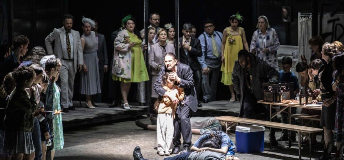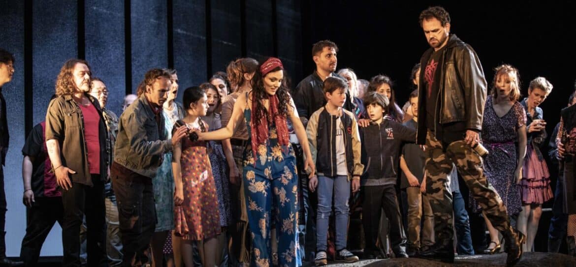 Nietsche aurait sans doute été content d’entendre Manru, sorte de Carmen d’inspiration wagnérienne. Car cet opéra met deux mondes face à face : celui des paysans et celui des tsiganes. L’actualité brûlante du sujet nous prend à la gorge lorsque s’ouvre le rideau du deuxième acte, nous laissant sous le choc de la maisonnette du couple de héros taguée d’un « On est chez nous », rappelant de insultes d’autant plus actuelles que le maire de Saint-Brévin vient de démissionner à cause de tels actes racistes. L’utilisation – habile – d’un plateau tournant tout au long des trois actes, nous permet de découvrir un « Sale étranger », puis d’autres tags sa faisant plus nombreux (« Dehors ! ») qui résonnent de façon terrible. Car Manru est une œuvre contemporaine sur la haine de l’autre et son rejet.