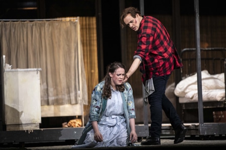 Ulana la paysanne est campée par la formidable Gemma Summerfield, à la voix ample, ductile, jamais en force, aux pianissimos aériens, toujours en phase avec un personnage malmené par la vie, tour à tour poétique et rageuse, amoureuse ou désespérée. Elle est mariée au tsigane Manru dont elle a un enfant. Mais sa mère, Hedwig (Janis Kelly en demi-teinte), ne supporte pas cette mésalliance et renie sa fille. Seul le gnome Urok (impressionnant Gyula Nagy, tant par la voix que par le jeu de scène), amoureux transi, la soutient dans cet environnement si hostile qu’à la fin du premier acte, les paysans sont sur le point de lyncher Manru et chassent le couple devenu proscrit dans un moment de tension musicale portée à incandescence par la cheffe d’orchestre.