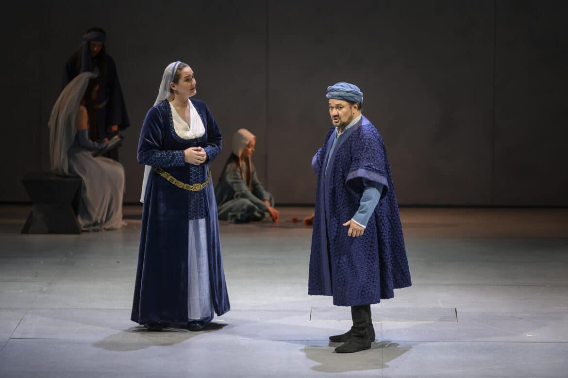 Si l’intention de la metteuse en scène Sarah Schinasi, telle qu’on la lit dans le programme, est louable (message pacifique, plaidoyer en faveur d’une Jérusalem multiconfessionelle), elle peine à s’incarner dans un spectacle très sage, prenant place dans des décors à la sobriété revendiquée mais sans doute excessive : ils sont constitués pour l’essentiel de panneaux nus, coulissant verticalement ou latéralement, que les beaux éclairages de Bruno Ciulli ne parviennent pas vraiment à « habiller ». Les costumes de François Raybaud sont quant à eux plutôt élégants (n’étaient les manteaux des conjurés à la cinquième scène du premier acte, que de vilains reflets apparentent malencontreusement à des capes en plastique). Mais il aura manqué surtout une direction d’acteurs acérée, apportant aux situations la tension que leur refusent la musique (parfois), et le livret (souvent). Les choristes, notamment, sont constamment livrés à eux-mêmes : qu’ils prient, implorent, appellent à la rébellion, à la guerre, à la paix, ils restent invariablement figés devant le public, sans faire aucun geste (c’est tout juste si quelques croisés daignent dégainer leur épée pendant le « Guerra, guerra! S’impugni la spada »), se contentant de se laisser porter par un praticable roulant qui les mène à l’avant-scène quand ils chantent, puis qui recule quand le chœur s’achève – un procédé qui devient vite très lassant…