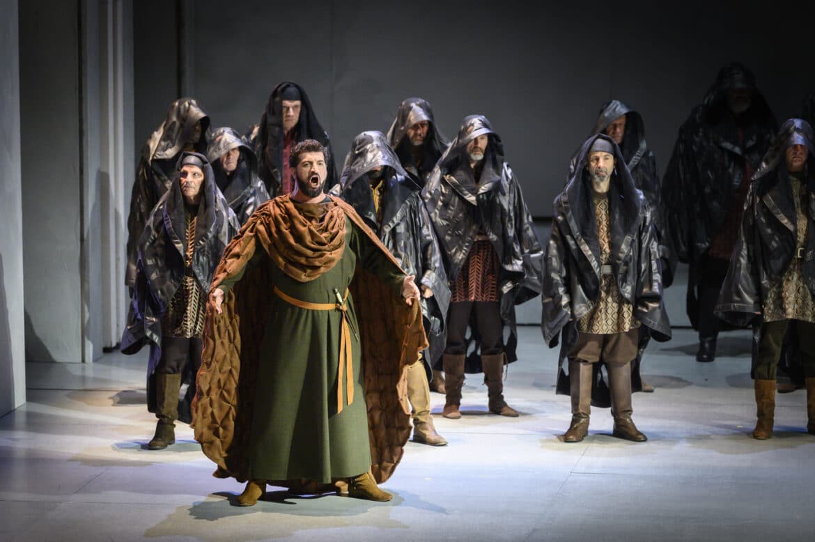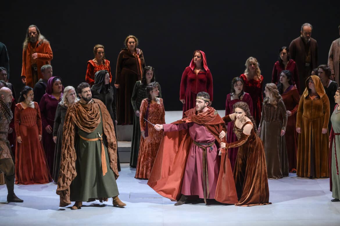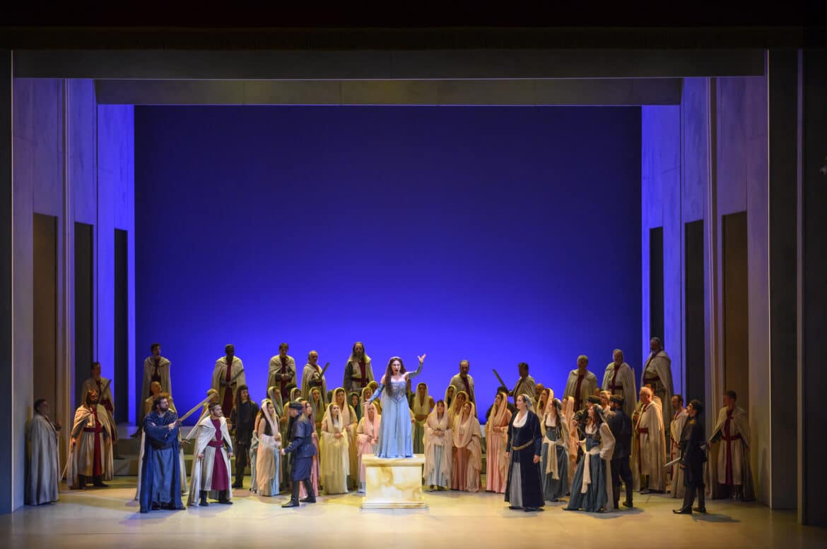 Vocalement, sans être parfait, le plateau est de qualité, jusque dans les seconds rôles, avec notamment de belles interventions d’Aurore Daubrun (Viclinda), Caroline de Mahieu (Sofia) ou encore Luc Dall’Amico (Pirro). Matteo Roma est un peu jeune de timbre pour le rôle du père Arvino : la voix manque quelque peu de densité, mais la projection impressionne et vaut au ténor de chaleureux applaudissements. Le cas de Ramón Vargas est tout autre : au bout de trente années de carrière, l’émission vocale a perdu de sa stabilité et la projection de son aisance, mais on reconnaît toujours les couleurs si particulières de son timbre et la sensibilité que le chanteur apporte à son interprétation lui vaut là aussi un beau succès. En dépit de certaines notes un peu « fixes » (surtout dans l’aigu), Goderdzi Janelidze convainc en Pagano, dont il traduit bien l’ambivalence (brutal au premier acte, repenti et en quête de pardon aux trois derniers). Reste l’impossible rôle de Giselda, dont peu de chanteuses ont su concilier la différentes facettes vocales, allant du chant suave et recueilli de la prière « Salve Maria! » à l’éprouvant « No!… Giusta causa – non è iddio » où les aigus tranchants le disputent aux sauts de tessiture assassins et aux vocalises di forza. Salome Jicia est l’une des chanteuses capables aujourd’hui de rendre justice à ce rôle : le soin apporté à la ligne de chant et aux nuances évoque la tendresse et la douceur du personnage, et sa technique de coloratura di forza lui permet quant à elle (au prix de quelques duretés dans l’extrême aigu) de rendre toute la véhémence du personnage, en particulier quand Giselda se révolte contre les exactions commises par les croisés.