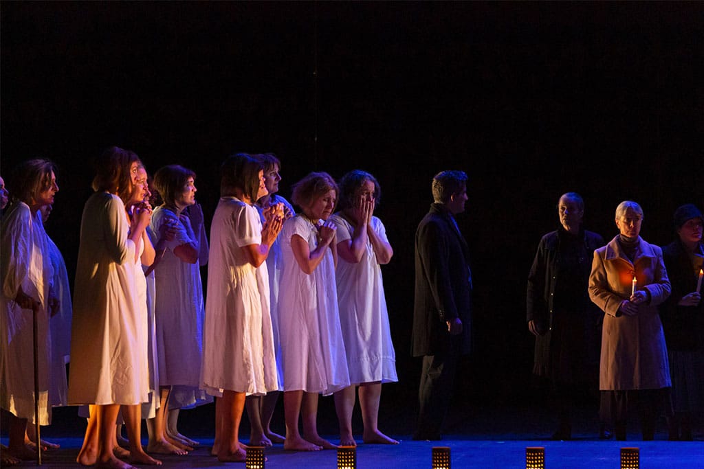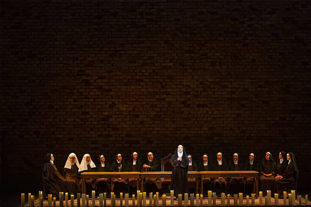 Le travail de Dominique Borrini qui règle les lumières du spectacle contribue lui aussi à la lisibilité et à la beauté plastique de ces Dialogues des carmélites. La quasi-totalité des tableaux baignent effectivement dans la lumière dorée d’une forêt de bougies et de cierges qui, associés à un nombre réduit d’accessoires (un fauteuil, un crucifix, trois grandes tables de réfectoire…), forment un contraste saisissant avec le noir d’encre des défroques des carmélites. À plusieurs reprises, ces bougies deviennent même un élément de décor à part entière. Qu’il s’agisse de la première rencontre entre Blanche de La Force et la Prieure ou de la scène du parloir, au deuxième acte, les cierges hérissés entre les protagonistes symbolisent la clôture imperméable qui isole l’univers clos du carmel de la frénésie du monde extérieur.