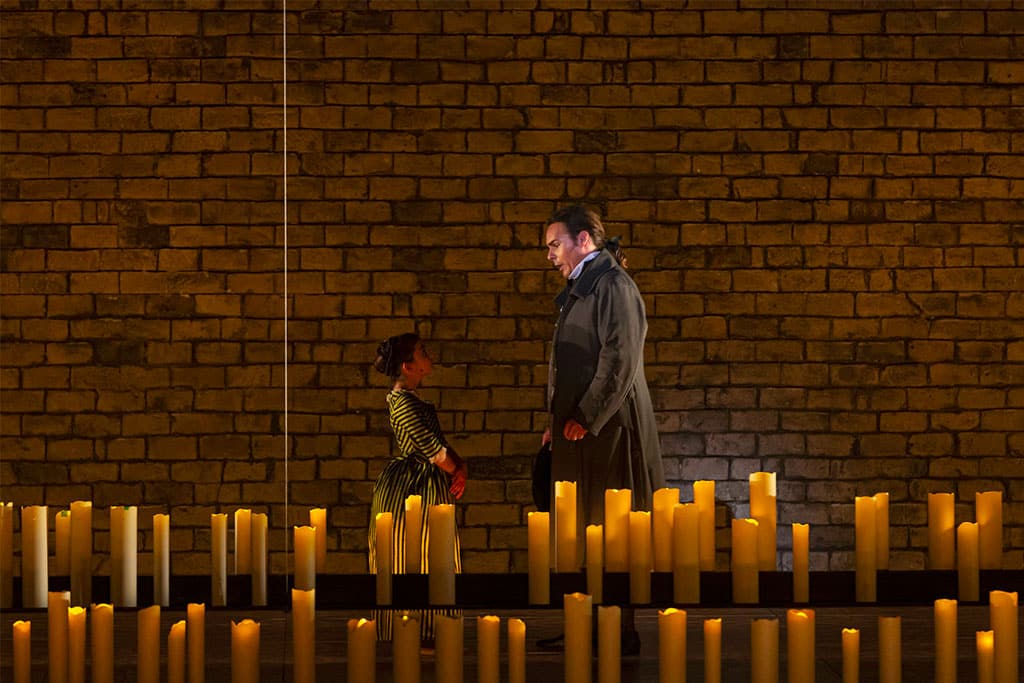 Mais c’est probablement dans le dernier tableau du troisième acte, pour illustrer la plus belle page de la partition, que Mireille Delunsch utilise le plus simplement et le plus symboliquement ces bougies. Après la lente procession de la guillotine de Jardin à Cour, les carmélites de Compiègne condamnées à mort se regroupent sur la gauche de la scène et entonnent en chœur un bouleversant Salve Regina. Tandis qu’à tour de rôle l’une d’elles se détache du groupe et monte à l’échafaud dissimulé dans la coulisse, le bruit sec du couperet souffle l’une après l’autre la flammèche des lumignons disposées à l’avant-scène. Chaque religieuse qui rend son âme à Dieu est donc symbolisée par une flamme qui meurt sur terre tandis que des étoiles s’allument une à une au firmament : le symbolisme est simple mais efficace, la force de ces instants ne détournant jamais l’attention du spectateur de la musique de Francis Poulenc.