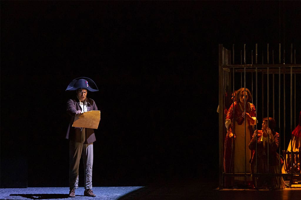 Parmi les nombreux seconds rôles qui n’interviennent dans ces Dialogues que sous la forme de quelques répliques, on retiendra surtout la silhouette fragile de Gaëlle Flores. Membre du chœur de l’Opéra de Bordeaux depuis 2001, elle prête son timbre de contralto bien projeté au personnage de Mère Jeanne et en livre un portrait parfaitement abouti grâce au travail qu’elle a dû mener avec la metteure en scène pour incarner vraiment son rôle. La (trop) courte apparition de Timothée Varon séduit elle aussi : affublé d’un immense bicorne qui lui donne des airs de gravure révolutionnaire découpée dans L’Ami du peuple, il livre la déclamation du geôlier avec un naturel qui atteste de la compréhension par le chanteur de chacun des mots du livret et témoigne d’une solide maîtrise de la grammaire du chant français.