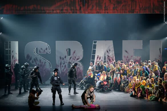 La réussite est totale. Policiers maniant le tonfa en terrorisant les hébreux, enfants des Philistins arrachés à leurs parents pendant le trio de la fin du troisième acte, partout la violence en action. Ces lettres formant le mot Israël, marquées d’empreintes sanglantes, élément clé du décor a minima, utilisées durant tout le spectacle, font sens en suivant l’évolution du drame biblique. Les éclairages de Pedro Yague n’y sont pas pour rien. Et l’apport de la vidéo n’a rien ici d’un gadget à la mode.