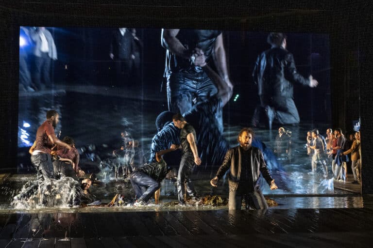 Avec la même intensité que ses autres productions qui ont fait sensation lors des dernières éditions du Festival d’Avignon, Jatahy s’attaque pour la seconde fois à l’opéra avec une approche originale, mais en utilisant des moyens qui ne sont pas inconnus sur les scènes d’opéra. On y trouve en effet deux grands miroirs qui se déplacent en oblique pour refléter les acteurs sur scène ou le public lui-même, un bassin d’eau dans lequel barbotent les chanteurs, des écrans sur lesquels sont projetées les images filmées par deux steadycams, des vidéos qui complètent les images réelles déjà riches, et des choristes disséminés dans les stalles. Bien que déjà vus à maintes reprises, ces moyens expressifs acquièrent ici une efficacité convaincante, presque inédite, comme l’énorme miroir qui se transforme en écran pour augmenter le nombre de personnages sur scène, faisant ainsi du chœur le véritable protagoniste. Le chœur dans les stalles n’est pas nouveau, mais il a toujours un impact émotionnel. On se retrouve alors tout près du siège d’une soprano qui se lève et entonne « Gran nume, che voli sull’ale dei venti« , ou quand, à la fin, résonne autour des spectateurs, dans les gradins et les galeries, le chœur « Va’ pensiero » entonné a cappella en guise de finale de l’opéra ! Le finale ? Nous y reviendrons.