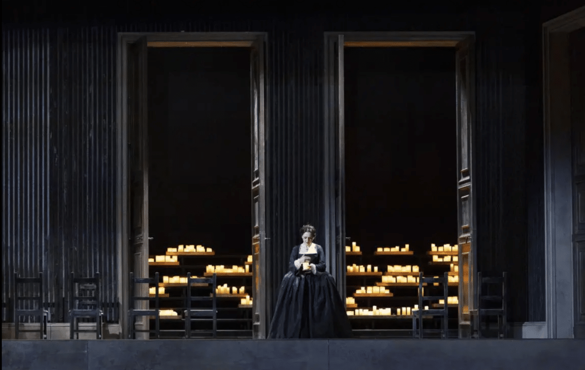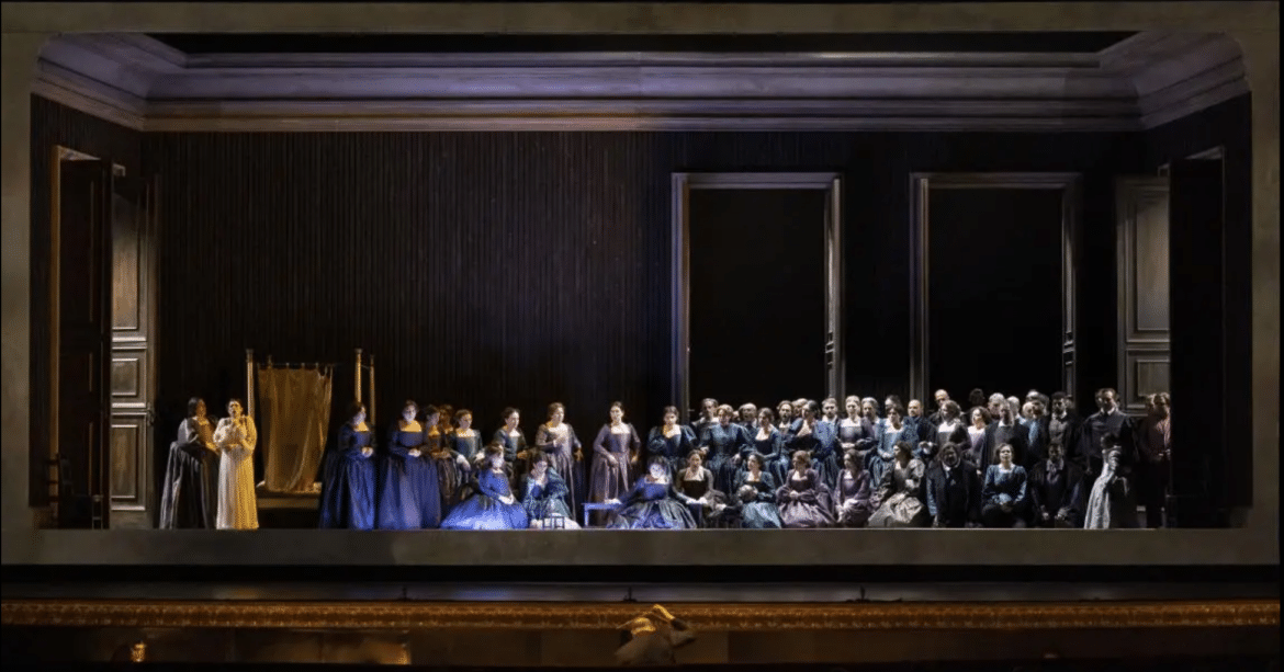 Dans des jolis costumes d’époque vaguement Renaissance, les personnages évoluent dans un décor néoclassique où trônent de grandes portes en nombre de deux ou de quatre selon les besoins de l’action. Une élégante chorégraphie est même esquissée pendant l’introduction, sur les notes de Smeton. Un énorme cerf est déposé sur une table juste avant le faux départ du souverain pour la chasse, alors que Giovanna Seymour se voit enfin revêtir du voile nuptial – sorte de filet ? – lorsque le destin de sa rivale est inexorablement scellé. Elle avait été déshabillée par le roi dès leur duo de l’acte I, traversant ainsi tous les événements en chemise de nuit. On comprend bien à quoi la destinent les avances du monarque…
