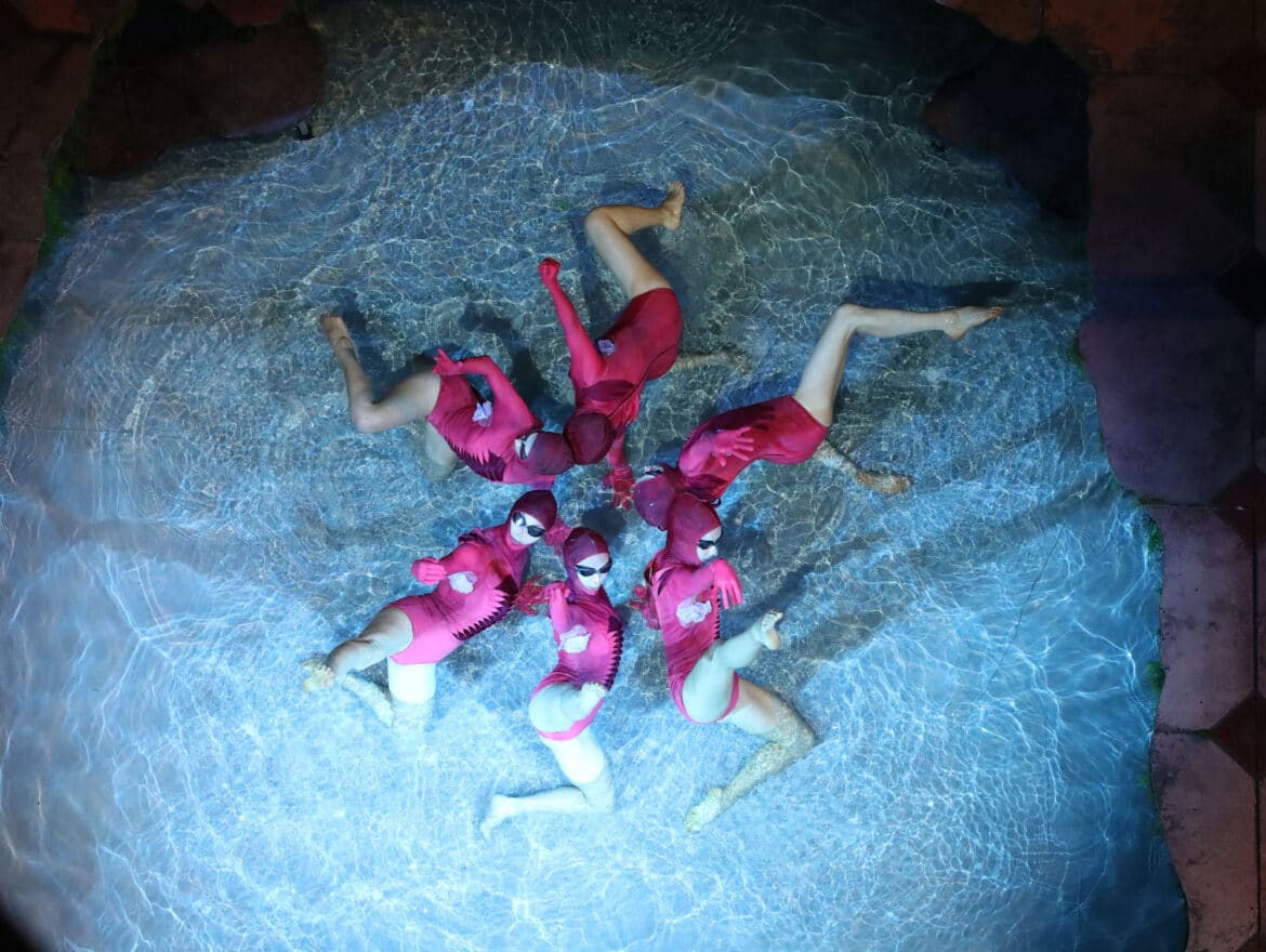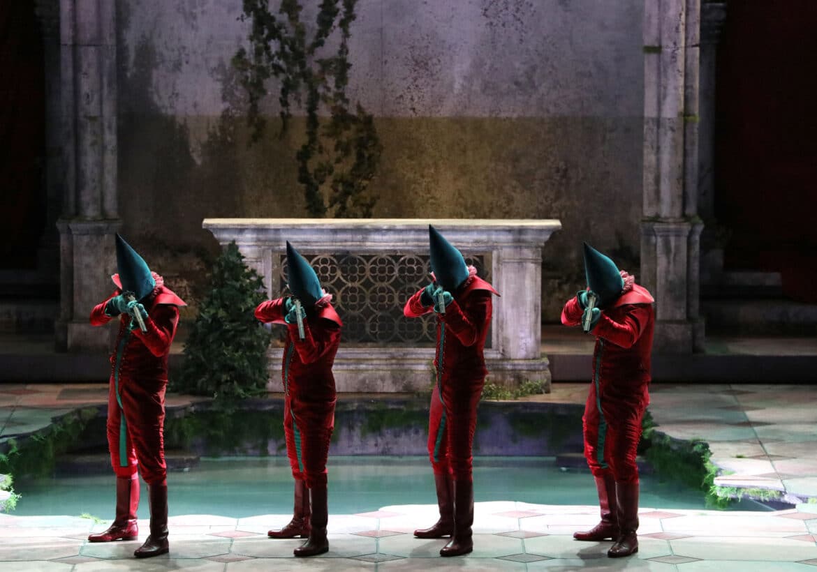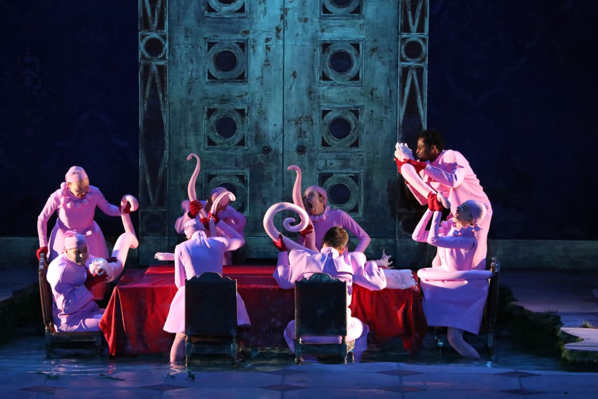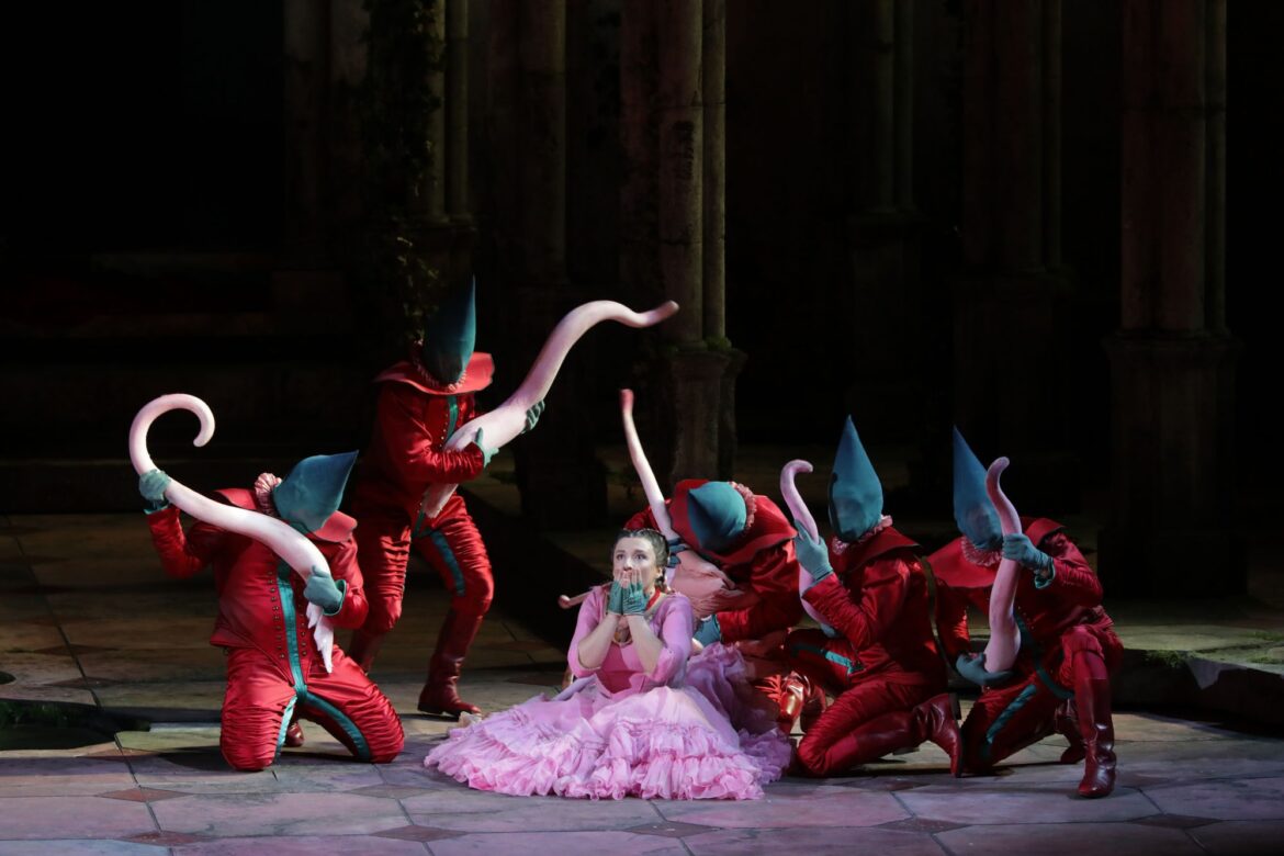 D’ailleurs le spectacle semble plus adapté à un ballet romantique traditionnel qu’à un drame de 1901 : Rusalka n’est pas La Sylphide de 1832, ni Giselle de 1842, et même sans convoquer un certain Dr Freud, actif dans ces mêmes années, il était légitime en 2023, pour un titre qui n’a jamais été joué à la Scala, d’espérer autre chose qu’un spectacle adapté aux enfants. Ni les costumes colorés de Vanessa Sannino – combien de rouges et de roses dans un monde qui se veut aquatique – ni les mouvements chorégraphiques envahissants de Sandro Maria Campagna, confiés aux animaux, aux chasseurs, aux nymphes, aux invités et à la suite de Ježibaba, n’aident à se défaire de cette atmosphère à la Disney. Dans le bassin d’eau sont exécutées des danses aquatiques dans le style d’Esther Williams, qui prendraient peut-être une dimension ironique si elles étaient visibles pour le public de l’orchestre. Le duo touchant entre la petite sirène qui veut devenir humaine et son père n’émeut pas du tout si l’esprit de l’eau apparaît sous la forme d’un calamar géant, et l’étincelle d’amour entre les deux jeunes ne peut s’allumer s’ils persistent à se tenir à distance l’un de l’autre, et si le prince déclare son transport au public, les jambes écartées à l’avant-scène. La metteuse en scène caractérise chaque personnage de manière précise : Rusalka apparaît sur une chaise roulante, avec des tentacules pendantes, et ressemble plus à une pieuvre qu’à une sirène ; même lorsqu’elle acquiert ses jambes, ses pas restent instables ; les courtisans ont des mouvements mécaniques (comme les bien-aimées marionnettes siciliennes !); la princesse est une figure arrogante comme l’est la Maléfique de La Belle au bois dormant, et Ježibaba une Reine-Sorcière comparable à celle de la Blanche-Neige de Disney. La patte de la metteuse en scène se révèle ici ou là, comme lorsque les nymphes défont leurs longs cheveux et les plongent dans l’eau, provoquant de grands jets – scène récurrente dans toutes ses productions –, ou lorsque, avec une méchanceté grotesque, elle nous montre les convives du banquet du prince dévorant goulûment les tentacules de pieuvre arrachés à la nymphe des eaux horrifiée.