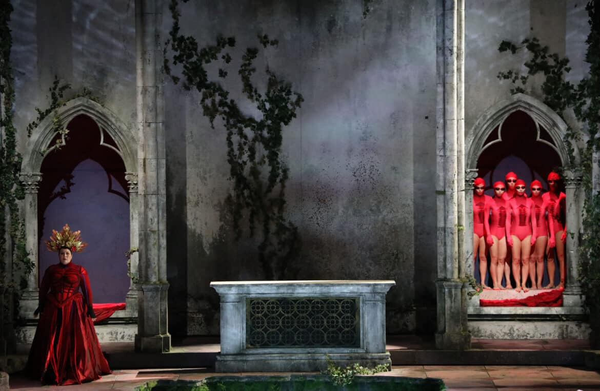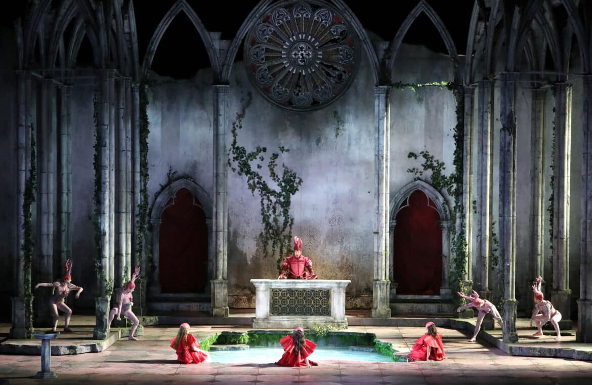 L’œuvre la plus célèbre d’Antonín Dvořák est montée pour la première fois à Milan, et la mise en scène est confiée à Emma Dante, se confrontant elle aussi pour la première fois à un conte de fées romantique. La lecture de la metteuse en scène sicilienne n’est cependant pas des plus convaincantes, et se limite au degré zéro de l’histoire : son illustration de l’élément féerique est très naïve, et ne comporte aucune des implications, notamment psychanalytiques, qui ont rendu les mises en scène de Robert Carsen (2002), Martin Kušej (2012), Stefan Herheim (2012) ou encore Christof Loy (2021), pour ne citer que les plus récentes, étonnantes et par ailleurs passionnantes. L’exubérance méditerranéenne de ses productions est ici totalement absente, la narration linéaire et le jeu d’acteurs rendent le spectacle très différent des précédents qu’elle a signés. La chaleur de la Sicile a été remplacée, sans grande conviction, par les brumes froides d’un Nord de convention qui se voudrait inquiétant sans y parvenir. Le décor de Carmine Maringola est quant à lui conventionnel : il donne à voir l’intérieur en ruine d’une église gothique avec une rosace et un bassin d’eau – pas tout à fait le lac entouré de forêts mentionné dans le livret de Jaroslav Kvapil. Et dans le deuxième acte, lorsque le rideau de feuilles animées se lève, nous nous trouvons plutôt dans le palais du prince charmant de Cendrillon. Les deux mondes, aquatique et humain, ne sont pas clairement délimités et le drame de la protagoniste n’est pas aussi déchirant qu’il devrait l’être.