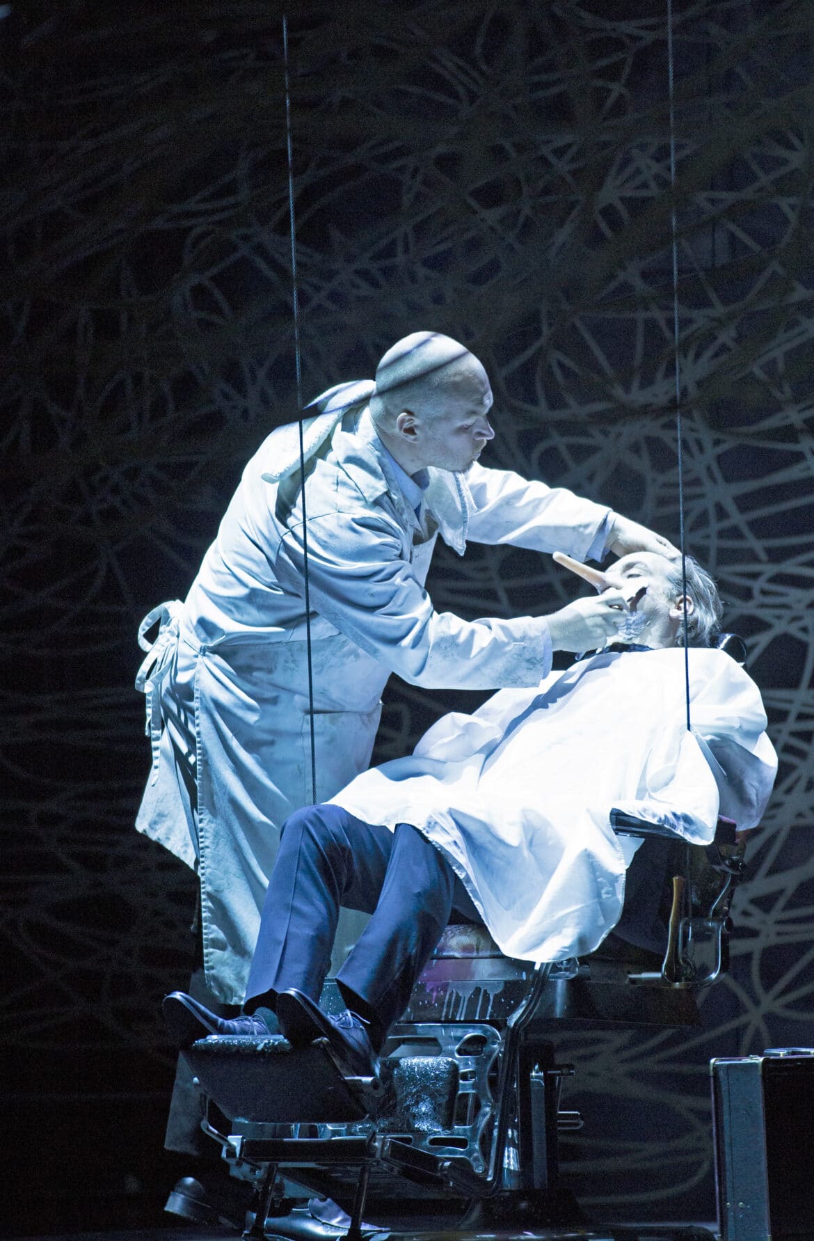 L’excellent Gergely Madaras fait des débuts remarqués à la Monnaie, à la tête de l’Orchestre symphonique et des Chœurs du théâtre : tous rendent remarquablement justice à cette partition exigeante entre toutes, procédant par juxtaposition de styles hétéroclites, et soulignent à merveille l’humour corrosif de la musique mais aussi son implacable construction dramatique. De la distribution, tout à la fois très nombreuse et extrêmement homogène, se distingue Scott Hendricks, excellent Kovaliov tourmenté, désespéré, grincheux, agressif, dont le beau baryton se déploie avec aisance dans une prestation alliant parfaitement la qualité du chant à l’efficacité scénique. Le timbre très particulier de Natacha Petrinsky (dans le double rôle de la Comtesse et de madame Podtotchine – avec un registre grave distinct du médium et de l’aigu et une émission quelque peu gutturale) contraste avec ceux de Giselle Allen (Praskovia énergique, à l’émission saine et franche) et Eir Inderhaug, qui chante ses interventions de la scène de la Cathédrale (haut perchée sur son trapèze) avec une belle assurance – elle est aussi une fille Podtochina convaincante. Signalons encore l’Ivan Iakovlévitch d’un Alexander Roslavets à la forte présence vocale et scénique, de même que les prestations de Nicky Spence (le Nez) et Anton Rositskiy (Ivan le valet mais aussi l’assistant du Chef de police), dont le registre aigu et le recours à la voix de tête sont étonnamment faciles. D’une manière générale, tous les artistes, jusqu’aux petits rôles, font preuve d’un abattage scénique réjouissant !