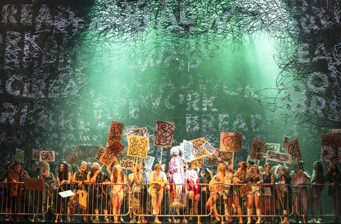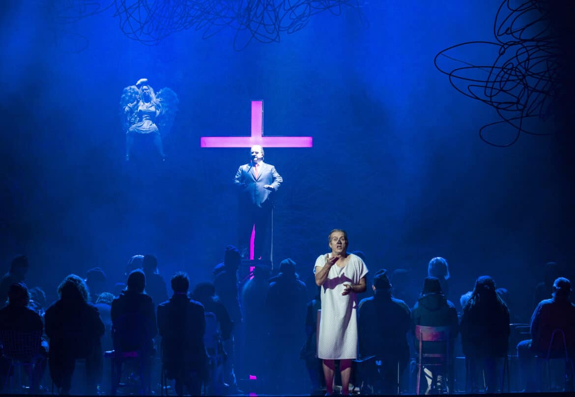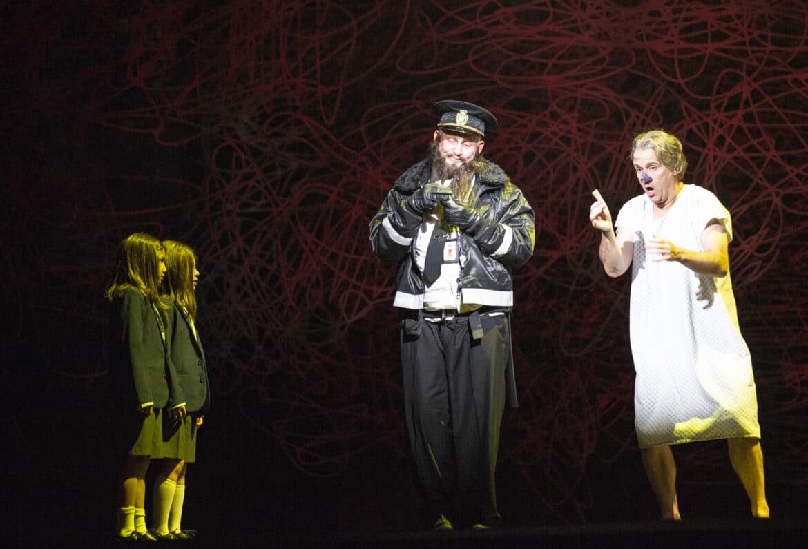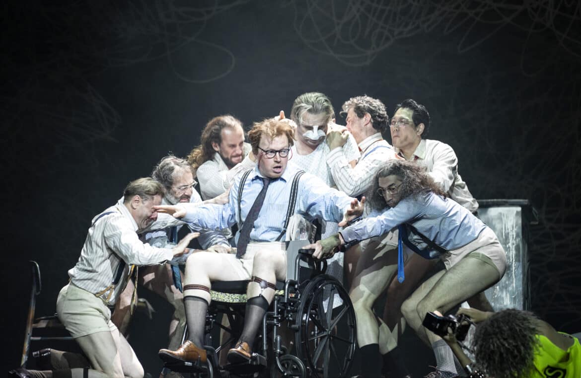 Pour mettre en scène Le Nez de Chostakovitch, on peut choisir d’opter pour une esthétique plus ou moins réaliste : Kirill Serebrennikov, à Munich, a récemment choisi de situer l’action dans un état policier des plus crédibles – et des plus effrayants – , où les forces de l’ordre, omniprésentes, évoluant dans un décor sobre et glacial, semblent avoir pour seule mission de priver les gens de leur nez, celui-ci devenant la métaphore de leur liberté de pensée et de parole. On peut aussi chercher un équivalent scénique au fantastique extravagant du livret et au comique grinçant (voire la férocité) d’une musique échappant à toute classification. C’est l’option choisie par Alex Ollé et son scénographe Alfons Flores, dont le spectacle prend corps dans un décor soulignant l’absurdité de l’intrigue, avec notamment ces grands pans verticaux couverts d’arabesques qui apparaissent comme la figuration graphique de l’imbroglio narratif. À l’apparition « anarchique », imprévue, de certains éléments (un trapèze sur lequel est assis un ange, un lit d’hôpital qui traverse la scène, un réfrigérateur dans lequel se trouve… l’amant de Praskova Ossipovna, les tentes et la douche d’un terrain de camping) répond l’incongruité des costumes (signés Lluc Castells) : les employés du journal sont tous en slip kangourou ; les religieuses portent d’austères robes noires dévoilant leur postérieur ; quant aux hommes, ils sont tous, d’une façon générale, grimés de façon grotesque : perruques ridicules, bikinis bariolés mettant en valeur leur bedaine, harnais tout droit sorti de la panoplie gay SM pour Ivan, le valet de Kovaliov… Une ambiance foutraque qui suscite le rire, mais aussi parfois un certain malaise et ne cache pas pour autant la noirceur et la férocité de l’être humain, comme dans cette scène à la fois drôle et terrible ou une jeune femme se prend en selfie avec le cadavre d’un homme venant d’être frappé à mort par un policier.