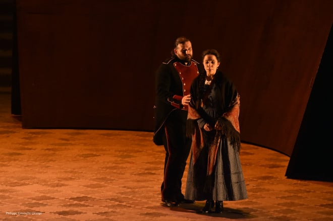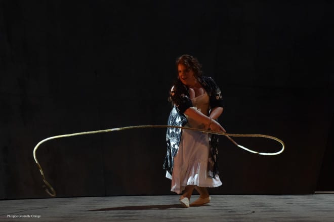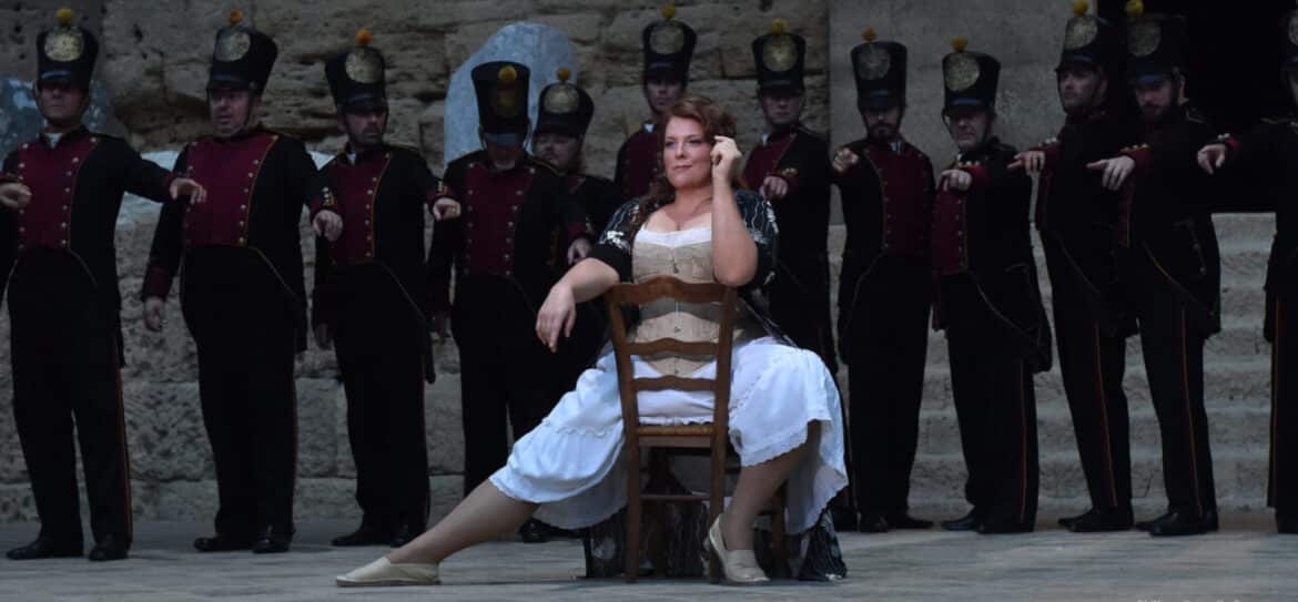 Mené de main de maître par la jeune cheffe montante Clelia Cafiero, l’Orchestre National de Lyon déploie toutes les couleurs et les nuances de l’orchestration de Bizet pour accompagner ce drame de la jalousie qui rassemble tous les ressorts de la tragédie, et l’inéluctabilité de la mort de l’héroïne. La configuration du théâtre antique nous permet d’apprécier l’énergie extraordinaire que Clelia Cafiero insuffle à ses musiciens pour nous donner à entendre une interprétation particulièrement enlevée et puissante tout autant que subtile et raffinée dans les moments plus intimes. Cette cheffe, qui se partage entre ses deux carrières de pianiste et de chef d’orchestre a sans nul doute un grand avenir dans cette dernière activité.