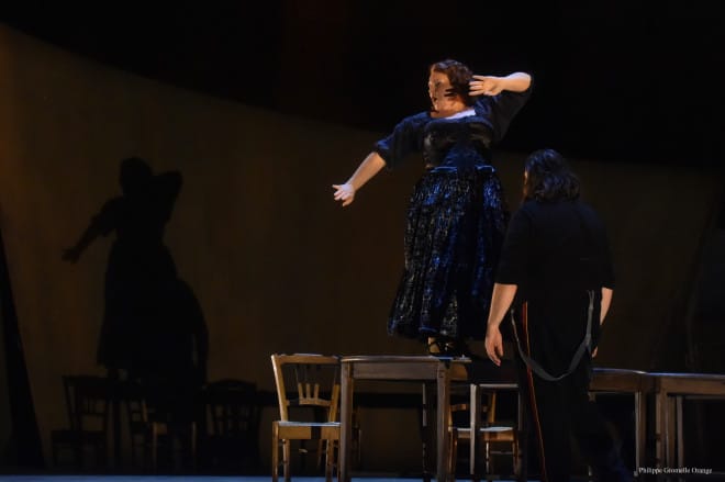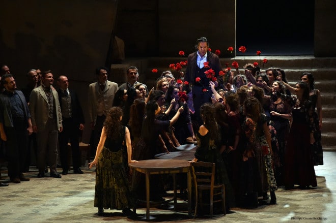 La mise en scène était signée Jean-Louis Grinda, directeur des Chorégies, qui a également mis en scène la Carmen donnée à l’Opéra de Marseille en février 2023. Tirant parti de l’immense scène à sa disposition, il imagine une ingénieuse structure mobile s’ouvrant en deux par le milieu et animée en direct, qui permet de délimiter les espaces selon les scènes intérieures et extérieures avec de subtils jeux d’ombres et de lumières. L’usage de la vidéo au dernier acte, donnant à voir l’intérieur de l’arène et la victoire d’Escamillo pendant le duo fatal de Carmen et José, vidéo projetée sur l’immense mur de scène du théâtre, est d’un très bel effet, accompagnée par les réminiscences de l’air du Toréador aux cuivres. Le contraste entre le drame qui se joue sur la scène et les images de triomphe et de joie est particulièrement saisissant avec cette mise en scène.
