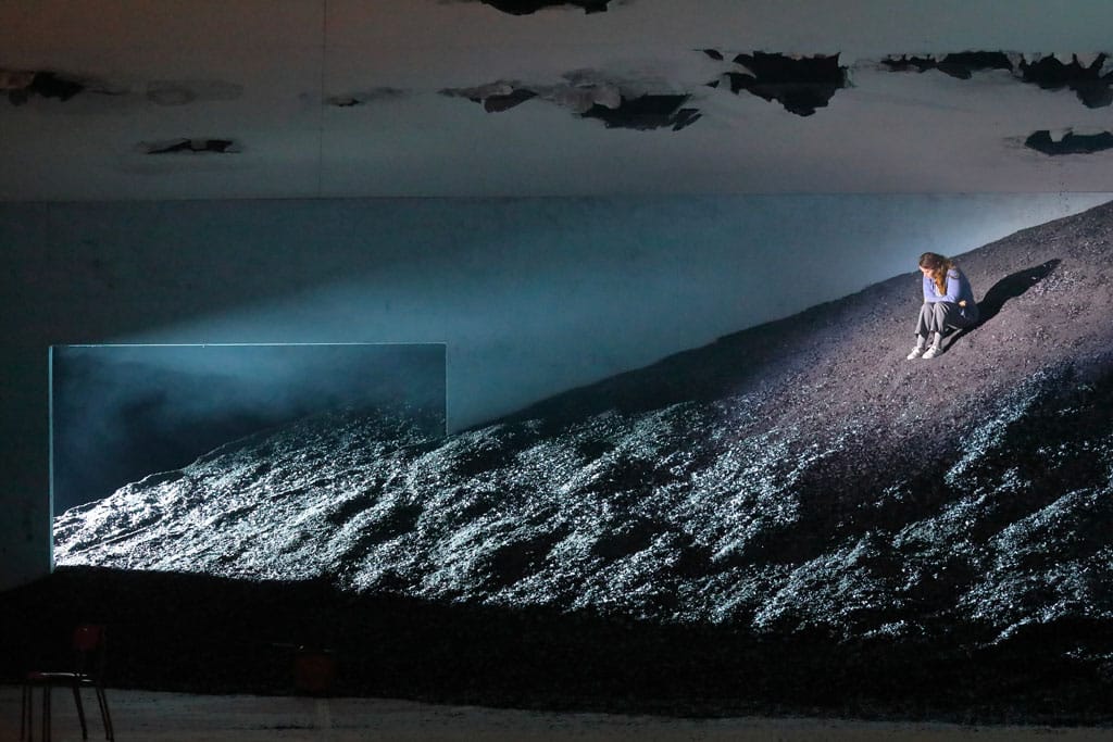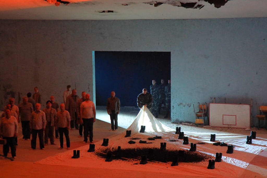 Michielottos Bühnenbildner Paolo Fantin hat für diese politisch-dystopische Interpretation des populären Werkes einen Einheitsraum für alle vier Akte geschaffen, einen hässlichen Zweckbau, der wohl in Friedenszeiten einmal eine Sporthalle war. Ein Schwebebalken, ein Turn-Pferd und ein abmontierter Basketballkorb zeugen noch von dieser ursprünglichen Bestimmung. Bombeneinschläge haben riesige Löcher in die Decke des Raums gerissen, durch die zeitweise wie ein böses Omen schwarze Asche rieselt. Der Hallenraum bietet sich als Einheitsbild an, da er gleichzeitig als öffentlicher Raum für die Massenszenen, als auch als intimer Innenraum genutzt werden kann, in dem sich das kammerspielartige Eifersuchtsdrama der drei Hauptfiguren abspielt.