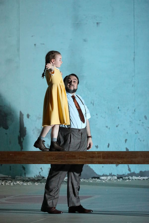 Traumhafte, irreale Bilder ziehen sich durch die optisch eigentlich nüchtern gehaltene Inszenierung: So begegnet Aida in einer Art Zeitreise ihrer eigenen Familie, sie selbst als spielendes Kind in zitronengelbem Kleid, daneben ihr Vater Amonasro und die verstorbene Mutter als freundliches bürgerliches Ehepaar. Und zu den himmlischen Klängen des „Addio Terra“-Finales erscheinen in Zeitlupe tanzende bunt gekleidete Paare mit Luftballons, darunter auch wieder die Eltern Aidas, als Botschafter einer besseren Welt, während das Liebespaar seinem Tod entgegensingt.
