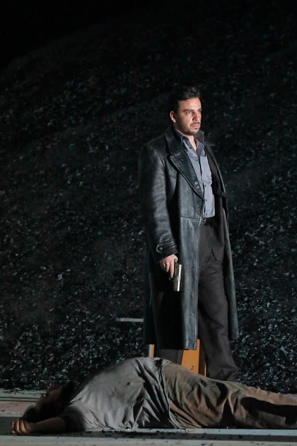 Regisseur Damiano Michielotto hat für seine aktuelle Münchener Inszenierung, deren Premiere am 15. Mai dieses Jahres stattfand, eine „Übersetzung“ des Stückes in die Jetztzeit gewagt, bei der der charakteristische Exotismus der Partitur völlig ausgeklammert wurde. Die verfeindeten Nationen Ägypten und Äthiopien scheinen irgendwo im postsowjetischen Osteuropa angesiedelt zu sein. Ein ethnischer Konflikt wird nicht thematisiert, auch werden keine kolonialen Ansprüche einer kulturell überlegenen Nation gegenüber einem besiegten „Barbarenvolk“ kritisch beleuchtet: Im Äthiopien von König Amonasro sehen die Menschen genauso alltäglich aus wie im Reich der Pharaonen, die Kriegsparteien fügen sich gegenseitig großen Schaden zu: Wer ist hier Angreifer, und wer Verteidiger, wer ist Täter, wer Opfer? Während der Bote, der vom Überfall Amonasros berichtet, im Original nur von verwüsteten Feldern spricht, trägt er nun die verhüllte Leiche eines kleinen Kindes auf dem Arm, ein unschuldiges ziviles Opfer in einem langanhaltenden militärischen Konflikt. Später muss Aida die trauernde Mutter dieses Kindes trösten, während sie selbst in der „Ritorna vincitor“-Arie ihr eigenes Leid klagt. Auch der berühmte Triumphzug kommt wenig triumphal daher, die heimkehrenden siegriechen Soldaten, allen voran der desillusionierte Radames, wirken freudlos und traumatisiert, einige laufen auf Krücken oder sitzen sogar im Rollstuhl, wie schon vor einigen Jahrzehnten bei John Dew. Aida wird also als ein zeitlos anklagendes Anti-Kriegs-Drama gedeutet, bei dem die einzelnen Menschen mit ihren privaten Träumen und Sehnsüchten an einer brutalen politischen Realität scheitern. Stellvertretend für die unmenschliche Macht des Staatsapparats tritt der Oberpriester Ramfis als finsterer Geheimdienstchef im ikonischen langen schwarzen Ledermantel auf, der die Fäden der Macht im Staat Ägypten in den Händen hält und selbst gegenüber der Königstochter Amneris übergriffig auftritt. Das Todesurteil gegen Radames wird am Ende von einem grauen Bürokraten an einem Schreibtisch am linken Bühnenrand aufgezeichnet, gegen ihn schleudert Amneris auch ihren verzweifelten „Anatema“-Fluch.