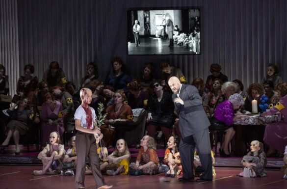 Michieletto avait également mis l’accent sur l’absence de maternité de la Dame, mais ce qui est différent ici, c’est la solidité de la relation du couple qui ne s’effondre jamais. Pas même à la fin, lorsqu’ils sont attachés l’un à l’autre, maintenant déments et physiquement épuisés, avant d’être lynchés par le peuple : elle avait été sauvée du suicide et avait vécu ses derniers instants avec son mari bien-aimé, chéri plus encore peut-être que le pouvoir. On trouve dans le spectacle de nombreux moments dans le style de Warlikowski, par exemple celui du banquet, où la Lady chante son toast dans le micro, tandis que Macbeth est hanté par la vision de Banquo qu’il a lui-même dessiné sur un ballon. Ou encore lorsque le dernier plat est servi et que sous la cloche, on trouve une poupée garnie de brocolis. Dès qu’ils sont couronnés après l’assassinat de Duncan, au milieu des apparats, une fois que la musique s’est arrêtée et que la foule s’est dispersée, Macbeth et sa Lady éclatent de rire devant la facilité avec laquelle ils se sont tirés d’affaire, mais ils réalisent immédiatement qu’ils ne peuvent rien souhaiter de plus… et c’est à partir de ce moment que leur drame et leur déchéance commencent : elle commence à boire, à parler de taches de sang inexistantes, lui souffre d’un complexe de castration de la part de sa femme/mère ou des sorcières – entre-temps, des images de l’Œdipe roi de Pasolini sont apparues sur l’écran de télévision – et à partir de ce moment, Macbeth vit dans un fauteuil roulant, aidé par des serviteurs.