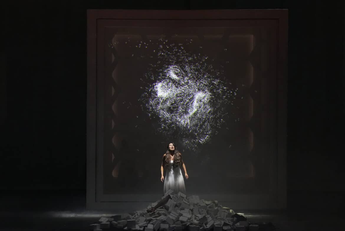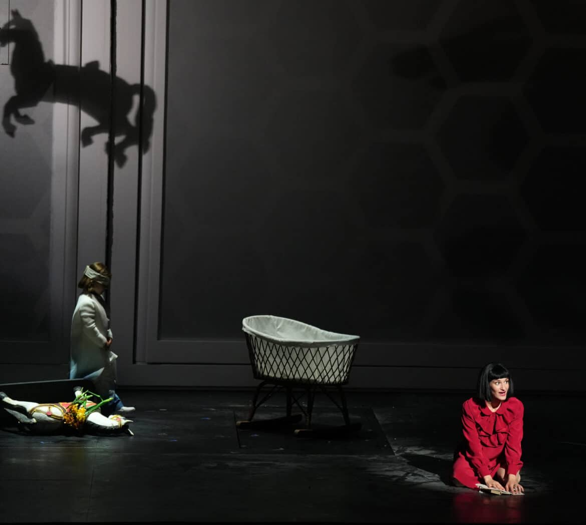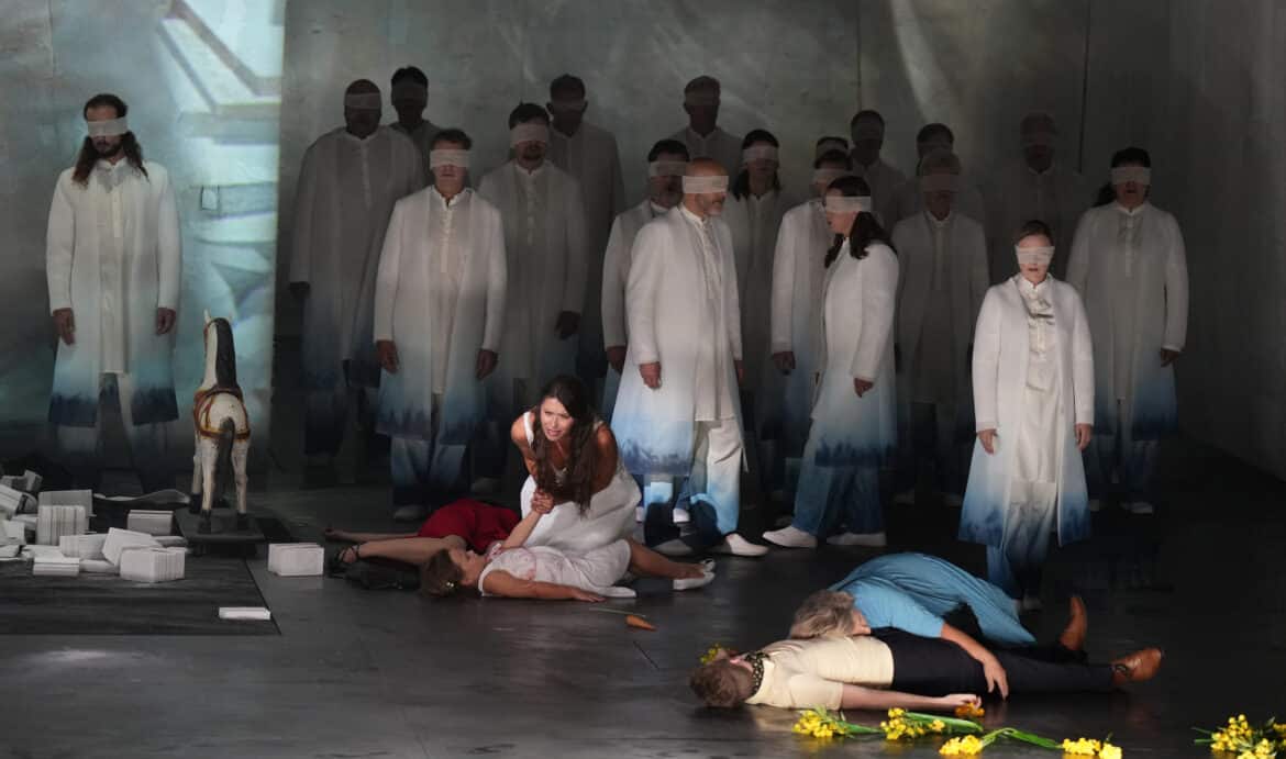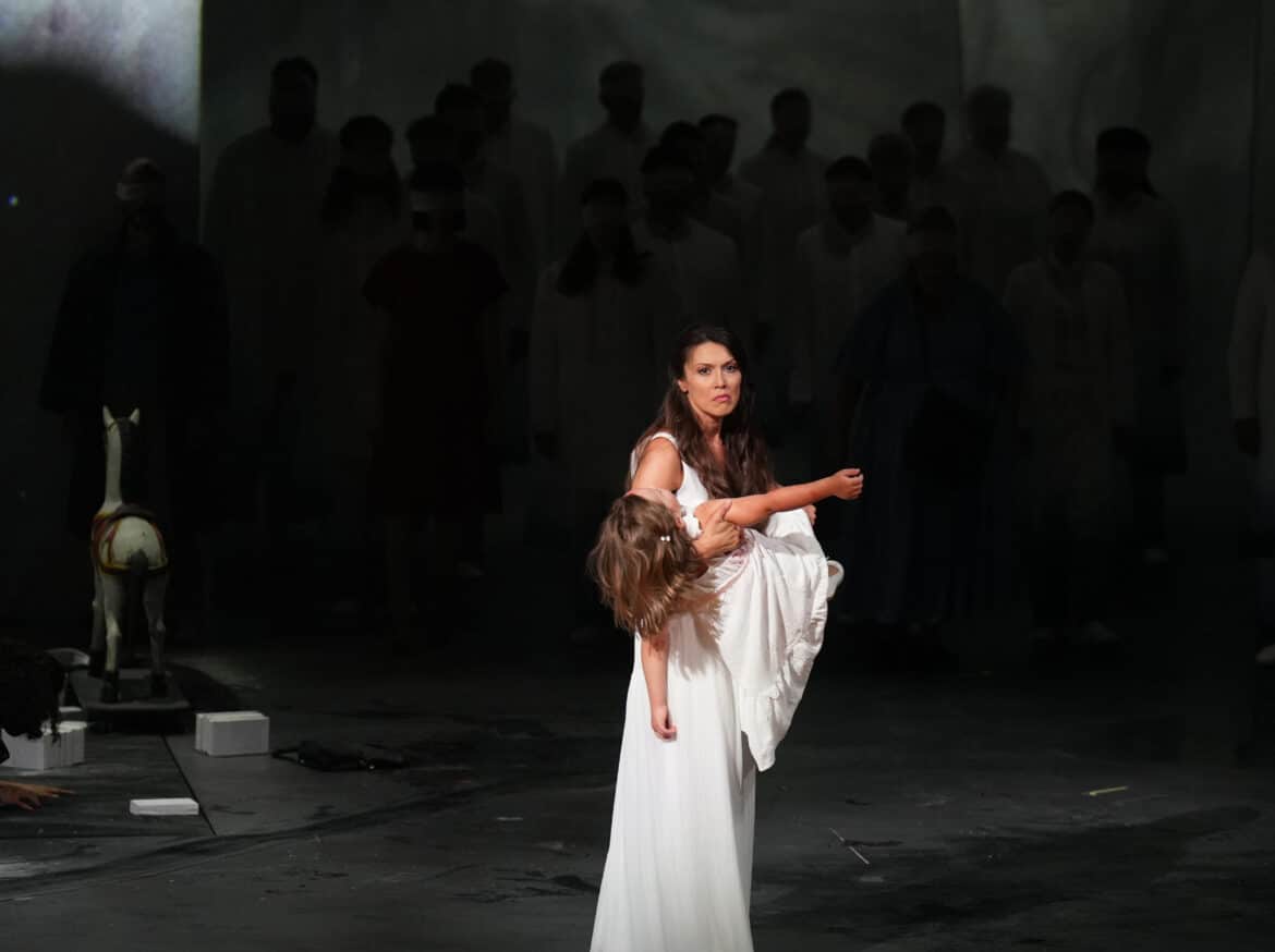 Visuellement, le spectacle proposé par Marie-Eve Signeyrole est séduisant et convaincant. Certaines images ne sont peut-être pas absolument nécessaires (Cassandra relevant ses jupes et s’accroupissant pour uriner), mais globalement la mise en scène sert parfaitement le propos des auteurs, avec un usage modéré et parfaitement justifié de la vidéo, une direction d’acteurs travaillée et certains tableaux visuellement très forts : l’effondrement du décor du premier tableau sur lequel est jeté un petit cheval de bois, image dérisoire du cheval ayant conduit Troie à sa perte – que l’on retrouvera sous la forme d’un inquiétant carrousel pendant la berceuse chantée par Mina ; le retour récurrent des images d’abeilles et d’alvéoles dans les éléments du décor, symbolisant tout le mal que l’homme et la femme font à leur planète et aux créatures qui l’habitent, la saisissante confrontation entre Sandra et Cassandra à la fin de l’ouvrage…