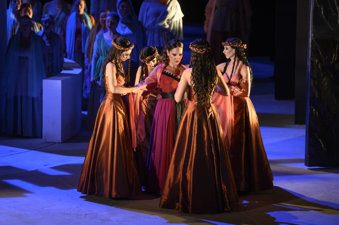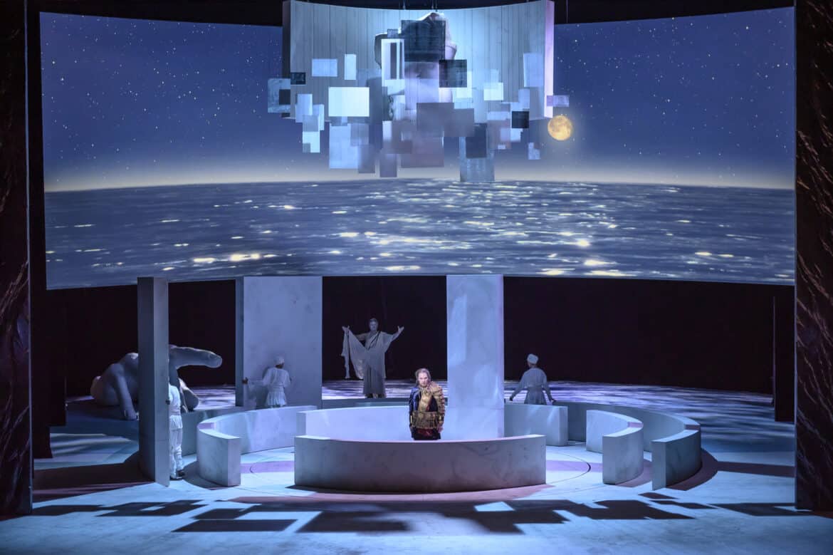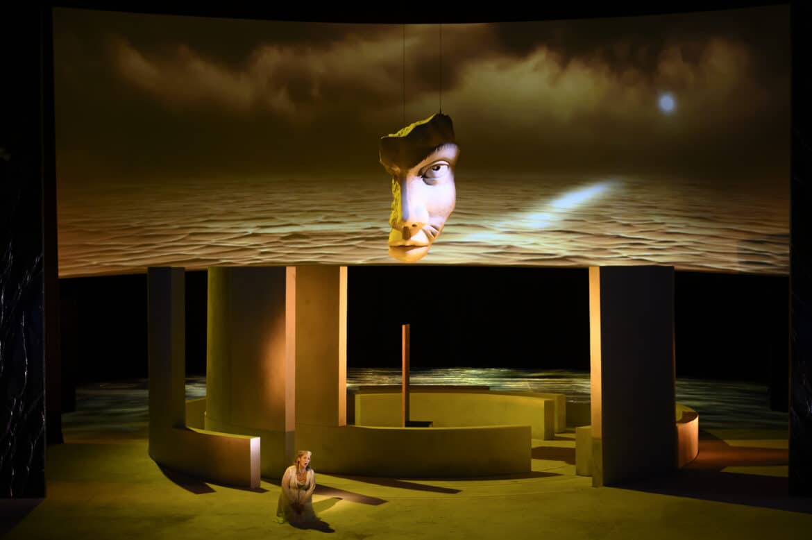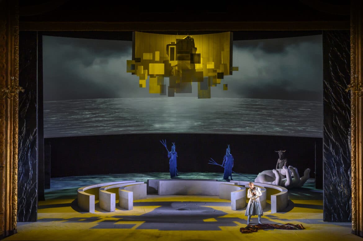Le spectacle s’est révélé d’une remarquable qualité d’ensemble. La mise en scène de Jean-Louis Grinda joue la carte de la sobriété et de l’élégance : sans chercher à actualiser coûte que coûte le propos (est-ce bien la peine lorsque le livret convoque des personnages, des dieux, des événements issus de mythes dont le propre est précisément de tisser des liens entre toutes les époques, toutes les cultures, y compris celles au sein desquelles nous vivons ?), elle choisit de mettre en lumière, avec efficacité et limpidité, le cheminement de l’intrigue ainsi que les tenants et les aboutissants dramatiques et psychologiques de la tragédie. Dans les décors épurés de Laurent Castaingt, la mer est omniprésente : un grand écran projette des images fixes ou animées de la mer de Crète, tantôt apaisée, tantôt menaçante, tantôt déchaînée, apportant un contrepoint visuel aux affects qui agitent les personnages tout en rappelant le poids du sacré et de la religion contre lesquels luttent les humains. Car au-delà de la mer, c’est bien la présence de Neptune qui s’affirme, par l’immense masque suspendu représentant le visage du dieu marin, ou encore l’apparition récurrente de créatures fantastiques, mi-hommes, mi chevaux de mer, telles qu’on peut en voir sur les mosaïques gréco-romaines représentant le dieu de la mer.