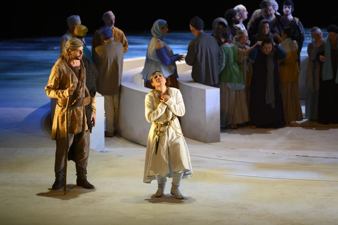 La distribution ne comporte guère de point faible et est d’une grande homogénéité. Annalisa Stroppa a pour elle une belle projection et une certaine arrogance dans l’accent qui en font un Idamante viril et volontaire ; la ligne vocale, parfois un peu anguleuse, pourrait cependant gagner ici ou là en souplesse. La voix de Maria Grazia Schiavo (récemment applaudie à Angers, Nantes et Rennes dans L’Elisir d’amore) présente dans un premier temps des couleurs qui semblent être celles d’un soprano (très) léger. Il n’en est rien : la voix, sans avoir toujours la pureté et la rondeur auxquelles on est habitué dans le répertoire mozartien, est fraîche tout en étant capable d’une belle ampleur et d’une belle intensité dans les moments dramatiques. Jonathan Vork (Grand Prêtre de Neptune), Inho Jeong (La Voix) et Riccardo della Sciucca (Arbace) tiennent très honorablement leurs rôles, avec pour ce dernier une belle interprétation de l’air du second acte « Se il tuo duol », en dépit de vocalises un peu précautionneuses. (Le second air d’Arbace, « Se colà ne’fati è scritto », bien que plus intéressant selon nous, est coupé).