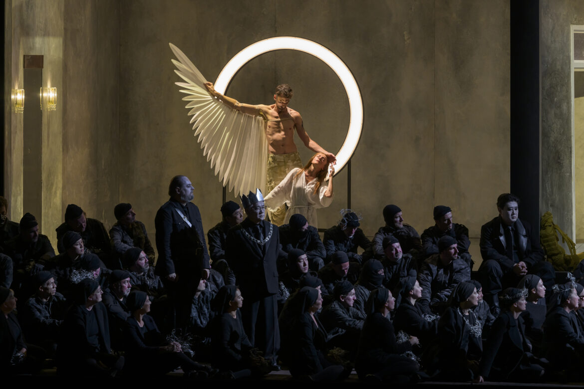 Musicalement, Alexander Soddy triomphe : sous sa baguette, l’orchestre délivre une lecture d’une grande poésie et garde une transparence et une clarté de tous les instants, y compris dans les tutti les plus éclatants. Chaque pupitre semble témoigner d’une excellente préparation et fait montre d’une remarquable précision, y compris les cuivres, si exposés et si fréquemment sollicités. Les chœurs, d’une homogénéité rare, ne sont pas en reste et remportent également un succès mérité, de même que leur cheffe Ching-Lien Wu. La distribution participe de ce même effet de légèreté et de délicatesse et nous évite tout démonstration vocale intempestive, avec même peut-être un léger déficit de puissance pour le Telramund de Wolfgang Koch lorsque le chanteur est amené à lutter contre les tutti de l’orchestre. Son personnage n’en demeure pas moins fort convaincant et a été très apprécié du public. La carrière de Nina Stemme semble prendre une nouvelle orientation (elle a annoncé récemment renoncer au rôle d’Isolde). Le vibrato est devenu un peu large et moins bien contrôlé que jadis, mais la qualité de la projection vocale reste intacte et l’incarnation est saisissante sur le plan dramatique. Le Héraut de Shenyang est parfaitement en situation, et le Heinrich der Vogler de Tareq Nazmi, puissant et noble, est d’autant plus méritoire qu’il remplace Kwangchul Youn initialement prévu, en s’étant visiblement intégré avec aisance à l’équipe et à cette lecture scénique si particulière. L’Elsa de Johanni van Oostrum est remarquable de fraîcheur et de poésie au premier acte, avec un très beau panel de nuances et un soin apporté à la ligne de chant que l’on n’entend pas toujours dans ce répertoire. La voix cependant accuse un léger passage à vide au milieu du second acte, et la chanteuse ne retrouve pas tout à fait la plénitude de ses moyens au dernier… Le Lohengrin de Piotr Beczala reste quant à lui un modèle de style et d’élégance. Le ténor arrive dans un état de fraîcheur vocale étonnant à l’issue d’un rôle long et exigeant, et déploie un riche éventail de nuances, notamment dans une scène finale poétique et très émouvante. Il sera très justement ovationné au rideau final.