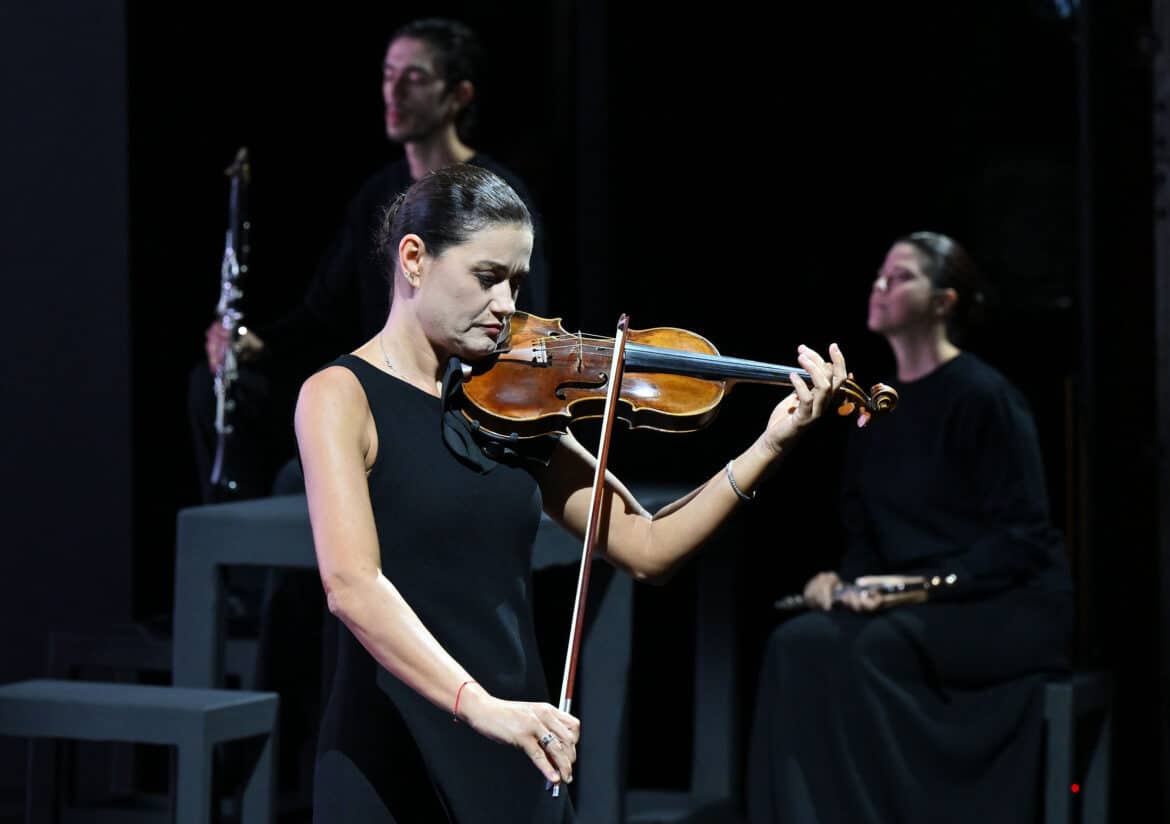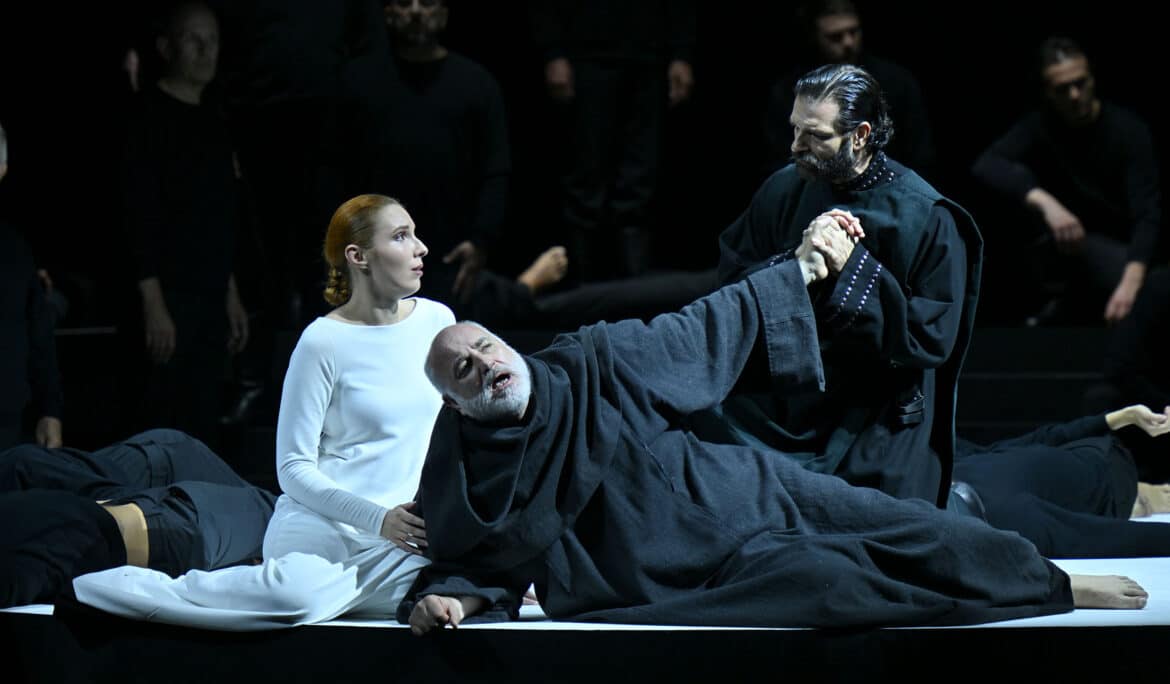 Enfin Pier Luigi Pizzi signe une mise en scène particulièrement sobre : la scénographie est simplissime (un plateau circulaire, quelques tables, des bancs), la profondeur et la variété des décors étant apportées par les projections, le plus souvent d’une grande élégance. Le metteur en scène semble avoir pris appui sur le finale de l’œuvre pour construire sa lecture de l’œuvre : au-delà de la réconciliation entre les deux frères Arvino et Oronte, c’est une réconciliation générale qui semble s’opérer, entre les guerriers qui viennent de se combattre et de s’entretuer… et qui se relèvent pour se livrer à de chaleureuses accolades. Un message de paix, d’amour, de pardon, qui semble véhiculé et favorisé par la musique elle-même, comme le suggère l’apparition finale de deux enfants portant un violon et un archet. La musique, au demeurant, est mise à l’honneur visuellement à plusieurs reprises dans le spectacle, avec l’apparition sur scène de plusieurs instrumentistes, dont la violoniste Mihaela Costea pour le solo du III.