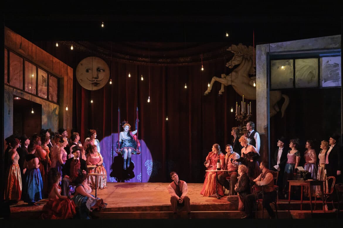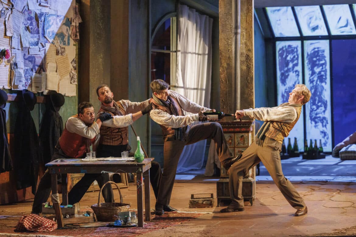 Suffit-il d’avoir du talent pour réussir à vivre de son Art ? C’est l’épineuse question à laquelle sont confrontés les quatre jeunes gens qui partagent une mansarde perchée sous les toits de la place Blanche, à Paris. Si le metteur en scène confesse s’être inspiré de l’univers du film Moulin Rouge de Baz Luhrmann récompensé en 2001 par les oscars des meilleurs décors et de la meilleure création de costumes (au deuxième acte, le numéro de cabaret de Musetta est un joli hommage à la scène de la balançoire avec Nicole Kidman), il y a aussi dans ce spectacle des références plus ou moins subliminales au plus académique French cancan de Jean Renoir, voire à l’univers onirique de Georges Méliès lorsqu’un visage lunaire traverse les cintres pendant le tableau du café Momus.