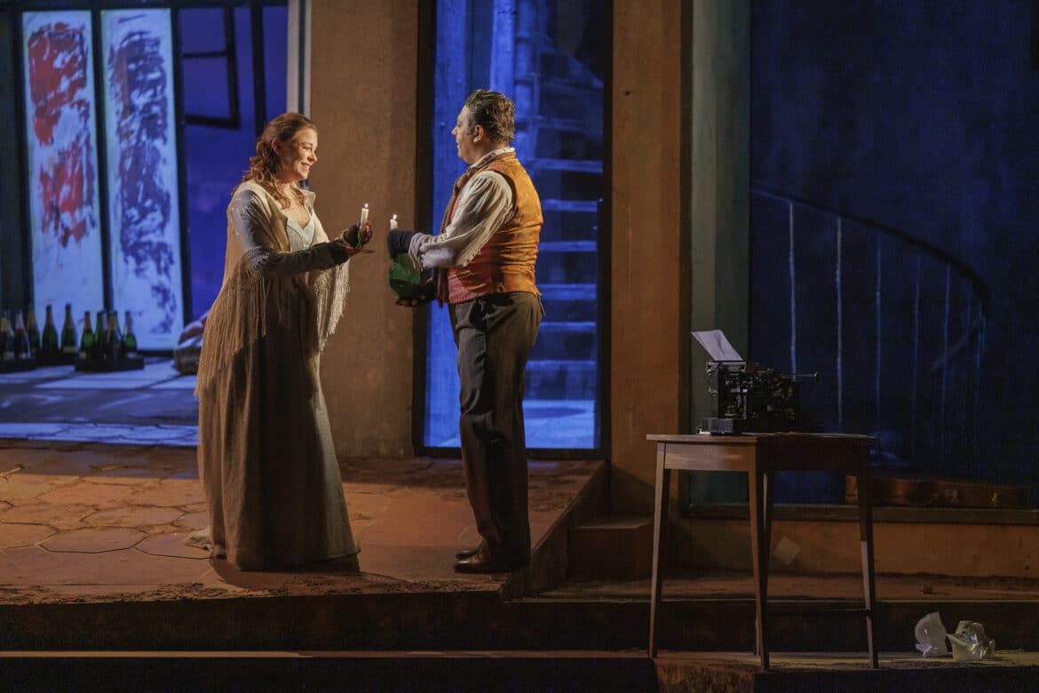 Ces tragiques amours ont-elles empêché Rodolfo d’accomplir sa vocation de poète ? Paul-Émile Fourny ne l’affirme pas frontalement mais la présence à l’avant-scène, d’un bout à l’autre du spectacle d’une machine à écrire et d’une petite table à laquelle il vient souvent s’asseoir témoigne probablement que Rodolfo ne s’est jamais arrêté d’écrire depuis sa rencontre avec Mimi. Commençant à prendre des notes tandis qu’elle lui confie qu’elle ne va pas souvent à l’église mais qu’elle prie néanmoins le Seigneur, le jeune poète tient la chronique de ses amours et la transfigure dans un roman dont l’opéra auquel nous assistons est une adaptation. Dans ce sens, le personnage de Rodolfo se confond avec la figure d’Henri Murger dont les Scènes de la vie de bohème ont inspiré Puccini (mais aussi Leoncavallo, dont l’opéra homonyme du roman français sera créé en 1897, un an après l’œuvre de Puccini) ; à la différence de Marcello et Mimi, l’écrivain conjure donc la malédiction de la vie de bohème et accomplit in fine sa vocation.