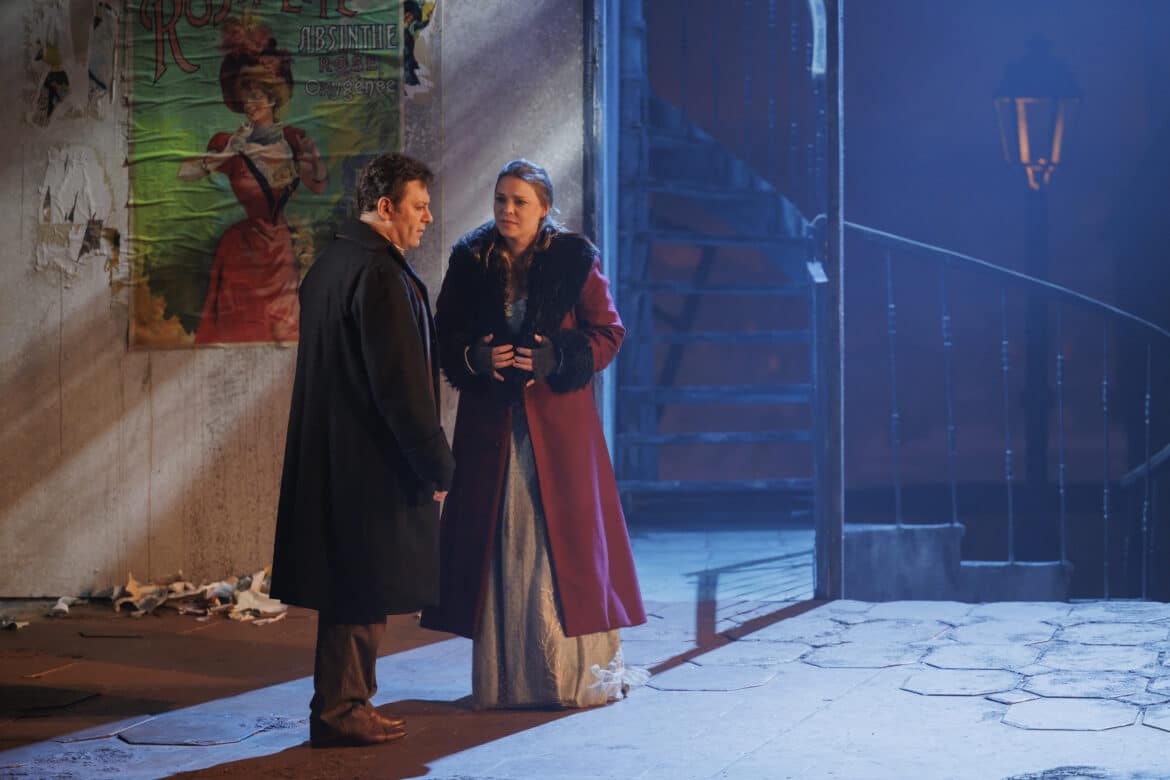 Originale et pertinente dans sa manière de retracer ces destins d’artiste plus ou moins aboutis, la mise en scène de Paul-Émile Fourny séduit aussi par quelques tableaux joliment troussés et des images artistement croquées à la manière des dessinateurs de la place du Tertre. Pêle-mêle, on retiendra notamment la baie vitrée qui, tout au long du premier acte, permet d’entrapercevoir ce qui se passe sur le palier de la mansarde des bohémiens et de découvrir toute la diversité des existences qui se croisent dans la cage d’escalier d’un immeuble haussmannien. Au deuxième acte, déjouant le piège de l’exiguïté de la scène messine, la scénographie accueille d’abord le spectateur sur le trottoir, devant le Moulin Rouge, puis le glissement d’un grand rideau rouge nous introduit dans la salle du cabaret, parmi les guéridons à plateau de marbre, pour assister à un numéro de danse inspiré des croquis de Toulouse-Lautrec. Relégué dans une loge d’avant-scène, le chœur d’enfants est à la fois spectateur et acteur de la retraite au flambeau et symbolise un trait d’union entre la salle et le plateau, le monde réel et l’illusion du spectacle. Au troisième acte, la simplicité de la barrière d’Enfer croquée en deux pans de mur et un alignement de quelques réverbères confinent à l’épure mais aident à recentrer le drame sur les silhouettes de Mimi, Marcello et Rodolfo.