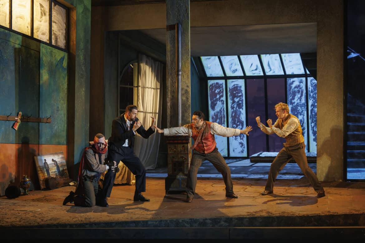 Schaunard et Colline sont souvent des personnages dont la silhouette reste floue dans la mémoire des spectateurs, leurs voix graves passant systématiquement au second plan des amours contrariées de Mimi et Rodolfo d’un côté, et de Musetta et Marcello de l’autre. C’est donc une vraie plus-value dramatique et musicale que de voir vivre et exister le musicien et le philosophe qui partagent la mansarde avec le poète et le peintre. À Colline, Alexey Birkus prête le grain sombre caractéristique des belles voix slaves et une sensibilité qui transparait dans chacune des notes de l’arioso « Vecchia zimarra, senti ». Le chanteur biélorusse y donne à entendre un timbre grave mais juvénile qui, a contrario d’une tradition gênante qui fait parfois de Colline un barbon égaré au milieu des autres bohémiens plus jeunes, séduit autant qu’il impressionne. Csaba Kotlár incarne quant à lui un Schaunard proche de l’idéal : silhouette dégingandée de grand gaillard gaffeur, acteur talentueux à la manière des premières stars du cinéma muet, le baryton slovaque a par ailleurs dans le gosier un diamant noir dont il se sert pour délivrer un chant parfaitement idiomatique. Celui-là ne devrait pas rester très longtemps confiné aux rôles de second plan : il a indubitablement le charisme et la voix pour chanter Marcello (qu’il a déjà interprété sur la scène de l’opéra de Liberec, en République tchèque) et d’autres personnages du répertoire encore plus exposés.