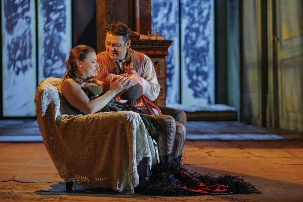 Perrine Madoeuf et Joan Martín-Royo composent un couple d’amis-amants aussi crédible vocalement que physiquement. De Musetta, la soprano d’origines lyonnaises a la frimousse mutine, l’abattage (indispensable pour rendre crédible la scène de ménage du deuxième acte) et surtout le timbre fluté qui lui permet de faire de « Quando men vo » un moment d’introspection suspendu au cœur d’un grand tableau plus bruyant. La manière dont elle répète rêveusement « felice mi fa » témoigne d’un incontestable approfondissement de la psyché du personnage et il faut tout le talent de Perrine Madoeuf pour rendre crédible la mue de l’artiste de cabaret en dame de la bonne société. En Marcello, l’artiste catalan Joan Martín-Royo donne à entendre un joli timbre de baryton très phonogénique et techniquement solide. À l’instar de ses comparses bohémiens, il se plie à tous les caprices de mise en scène de Paul-Émile Fourny et compose un attachant personnage de peintre incompris, qu’il s’agisse de ses expériences avant-gardistes en matière picturale ou de sa passion tempétueuse avec Musetta. Le duo avec Mimi au début du troisième acte permet à Joan Martín-Royo d’explorer une autre facette du personnage de Marcello, moins sanguin et plus empathique : les harmoniques de la voix se font alors plus riches et témoignent d’un métier déjà solide à force de bourlinguer sur les scènes des théâtres européens et sud-américains.