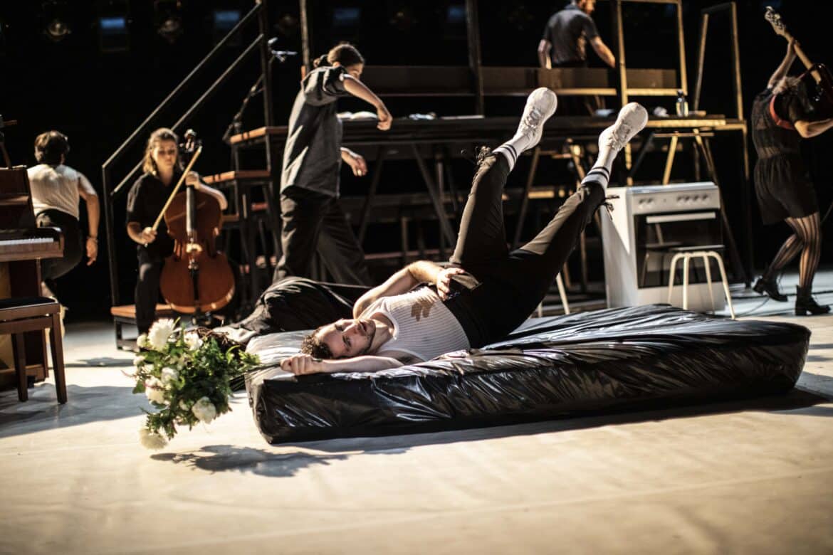 Deuxième remarque : comment passe-t-on d’une pièce dont la durée n’excède guère une demi-heure à un spectacle qui dure trois fois plus longtemps ? C’est là qu’entrent en jeu Maëlle Dequiedt et Simon Hatab à la dramaturgie. Clairement, l’objectif n’était pas d’illustrer littéralement le poème de Jacopone da Todi, mais de se livrer à une réflexion ou à une rêverie sur le message qu’il peut encore véhiculer de nos jours, à une époque déchristianisée. Pour « performer » ce Stabat Mater, le spectacle associe théâtre parlé et musique chantée et jouée, le texte latin mis en musique par Scarlatti ne bénéficiant pas d’un sous-titrage, alors qu’une traduction des scènes dialoguées en italien est projetée de part et d’autre de la scène. C’est donc moins le sens mot à mot du Stabat Mater qui entre en jeu que la sensualité de la musique où les voix se superposent, la représentation étant découpée en huit parties.