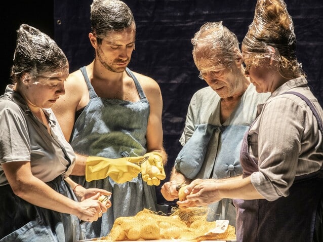 La première, « Rome 1700 », revisite la notion de sacré sur un mode quasi blasphématoire, avec défilé de mode ecclésiastique à la Fellini-Roma et concile/combat entre cardinaux, le vainqueur étant nommé pape, le tout commenté en italien comme un événement (sportif ?) par le clarinettiste Matteo Pastorino. On voit ensuite la mère de Scarlatti lisant en VO une prétendue lettre de son fils lui parlant de la commande reçue du Vatican, lecture qui dégénère en liste de commissions, avec une séance d’épluchage de pommes de terre. On passe ensuite au français, avec le monologue de la stupéfiante Emilie Incerti Formentini qui incarne à la fois un personnage et sa mère. Certaines scènes sont plus physiques, plus agitées, les Enfers sont évoqués en écho à l’ « Inflammatus » du Stabat Mater, et la dernière scène nous ramène à la relation mère-fils à travers l’affrontement de deux comédiens.
