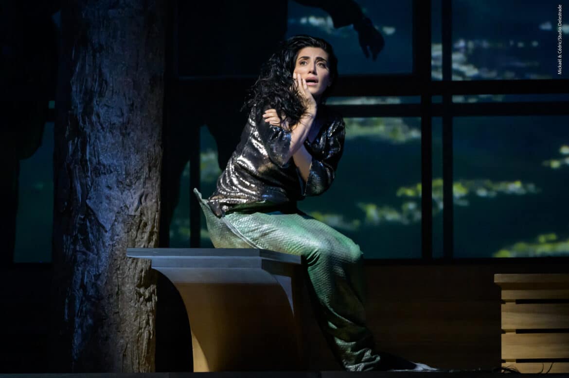J’avoue avoir été quelque peu déçu par la voix inégale de la jeune soprano arménienne Ani Yorentz Sargsyan. Si cette artiste dispose indéniablement d’authentiques et grands moyens vocaux… non encore totalement aboutis – l’assise dans le bas médium et dans le grave font ainsi, hélas, souvent défaut – on est en revanche totalement conquis par un jeu scénique dramatiquement bouleversant, qui sait occuper la totalité de l’espace scénique. Une artiste à suivre indéniablement. Si le prince de Misha Didyk, illustre ténor des dernières décennies, déjà apprécié dans ce rôle à Monte-Carlo il y a quelques années et, bien évidemment, dans le Hermann de La dame de pique, déçoit par une voix devenue moins souple et sonnant bien métallique désormais, la princesse étrangère d’Irina Stopina est faite d’un matériau vocal impressionnant qui, joint à une incarnation scénique vénéneuse à souhait, emporte totalement l’adhésion. Il est sans doute dommage d’avoir habillé la magicienne Ježibaba en technicienne de surface employée à l’entretien de la piscine, mais les moyens vocaux de la contralto Cornelia Oncioiu font vite oublier ce désagrément scénique. Enfin, tant du côté de Vodnik, l’esprit des eaux, incarné par le toujours impeccable Wojtek Smilek – aux faux airs ici de Philippe Lucas, l’entraineur de la championne Laure Manaudou ! – que du trio des nymphes vocalement sans reproche de Mathilde Lemaire, Marie Kalinine et Marie Karall, auquel on joindra volontiers les interventions remarquées du garçon de cuisine de Clémence Poussin et du garde forestier de Fabrice Alibert, cette distribution est un exemple d’homogénéité.
