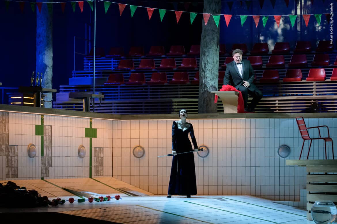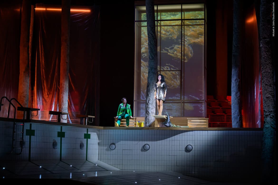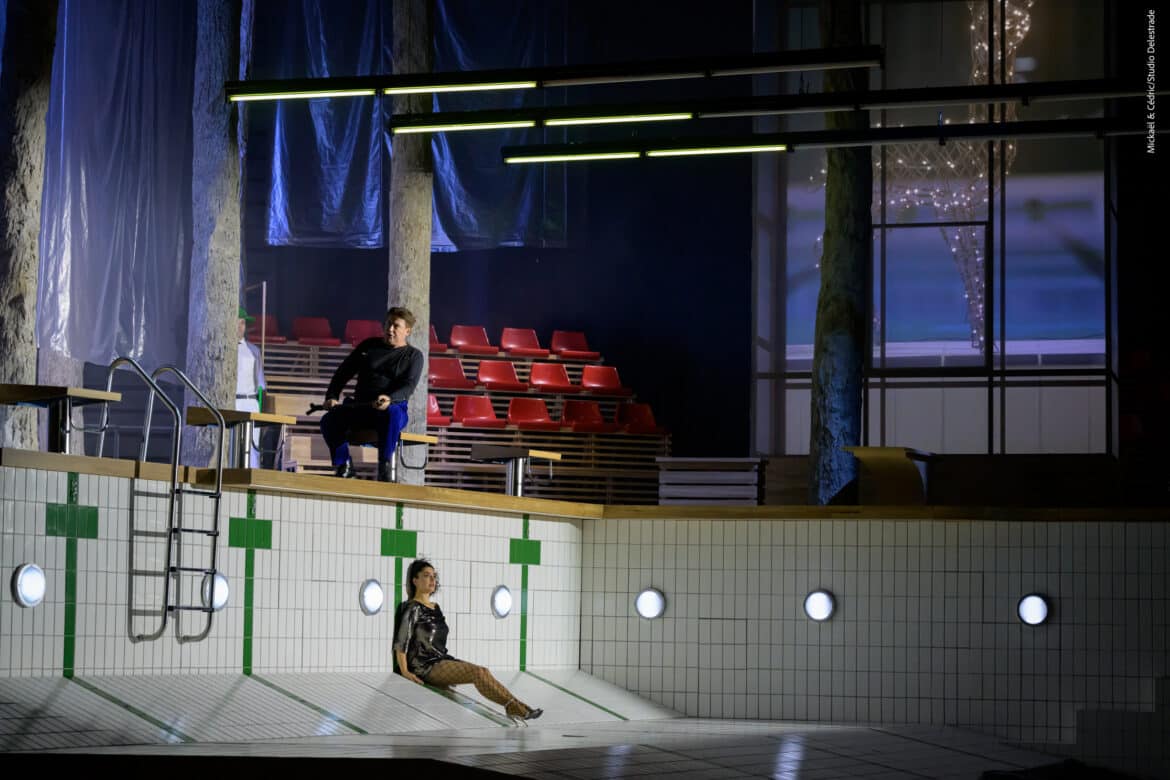Quelques accessoires indispensables à la parfaite compréhension de l’argument viennent compléter cette intelligente scénographie, tels que la queue de sirène de Rusalka dont celle-ci, dès son apparition en scène, ne sait déjà plus quoi faire et qu’elle traine comme un boulet, ou le harpon associé au prince. Enfin, le travail réalisé dans les ateliers de décors de l’Opéra de Nice doit être salué et permet d’admirer en particulier un bassin grandeur nature qui constitue, avec son indispensable plongeoir – dont Rusalka ne peut plus être la championne – le cadre d’action de l’ouvrage.