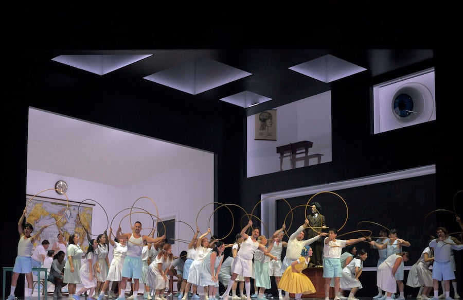 Presque en même temps que l’Opéra Royal de Wallonie-Liège, qui l’a monté avec Stefano Poda, et en attendant la reprise de la production de Robert Carsen à l’Opéra de Paris dans quelques jours, la mise en scène des Contes d’Hoffmann est ici confiée au Vénitien Damiano Michieletto, qui aborde cet opéra fantastique avec sa personnalité toute particulière. Dans sa lecture, le poète Hoffmann est un vieil homme plus ou moins enfermé dans une auberge, qui commence à écoquer les fantômes de son passé, les trois aventures amoureuses qu’il a vécues avec trois femmes différentes dans trois villes différentes : à Paris, Olympia ; à Munich, Antonia ; à Venise, Giulietta. Ces trois figures se confondent avec celle de la chanteuse Stella, qui chante Anna de Don Giovanni à ce moment-là à Nuremberg, où se déroule l’action du présent. Olympia représente le premier amour, celui de du temps de l’école, et c’est d’ailleurs dans une école que Michieletto situe l’épisode de la poupée mécanique – comme il l’avait fait dans sa Flûte enchantée – où Spalanzani est le professeur et Cochenille le concierge. La valse dans laquelle est entraîné Hoffmann, un jeune homme en culottes courtes, est une leçon de gymnastique avec des cerceaux, et le spectacle de la poupée mécanique se déroule sur une danse de nombres et de symboles mathématiques qui se détachent du tableau noir et tombent en pluie du plafond. L’univers surréaliste se confond ici avec un regard nostalgique sur l’amour adolescent.