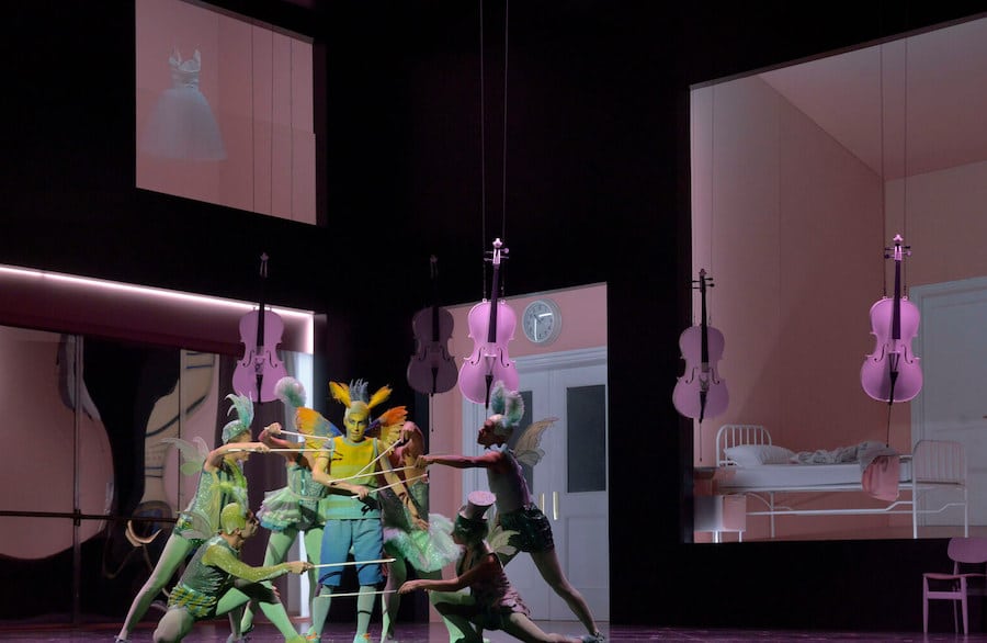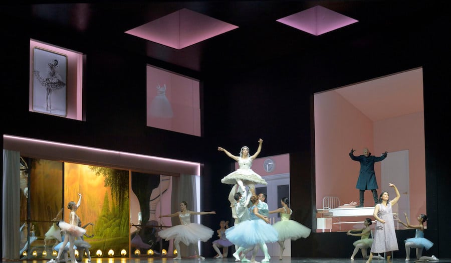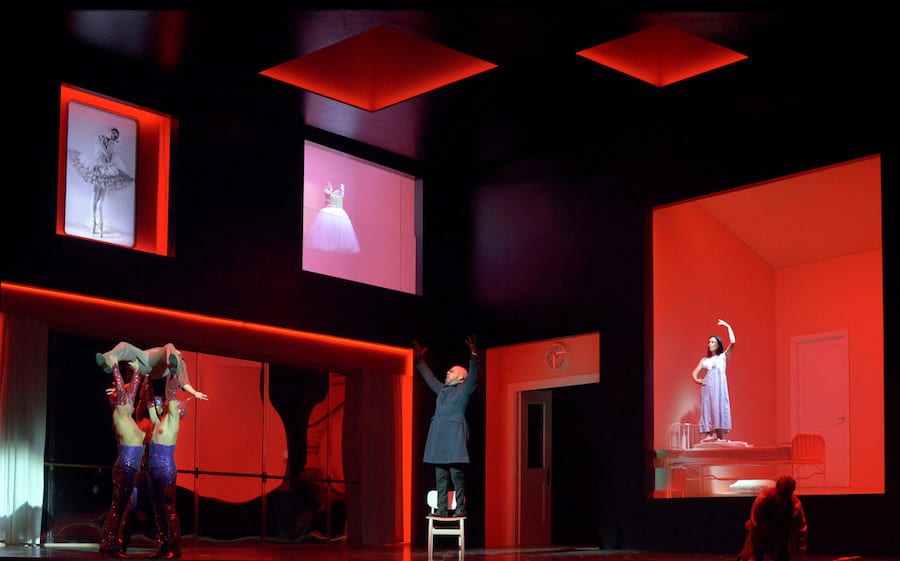 Le deuxième acte se déroule également dans une école, mais de danse cette fois. En effet, pour Michieletto, Antonia n’est pas une chanteuse, mais une danseuse alitée – comme dans sa Cendrillon à Berlin ou la Rusalka de Christof Loy. Malgré une tonalité très dramatique, ce tableau prend des couleurs joyeuses grâce à la présence de petites ballerines en tutu qui se moquent de Frantz, un maître de ballet caricatural. Le contraste est fort entre humour et pathétisme avec la mort d’Antonia incitée à danser par le diabolique Docteur Miracle. Hoffmann est ici un jeune homme dans la deuxième phase de sa vie, plus amoureux de l’idée de l’amour que de la pauvre jeune fille.