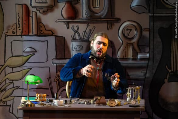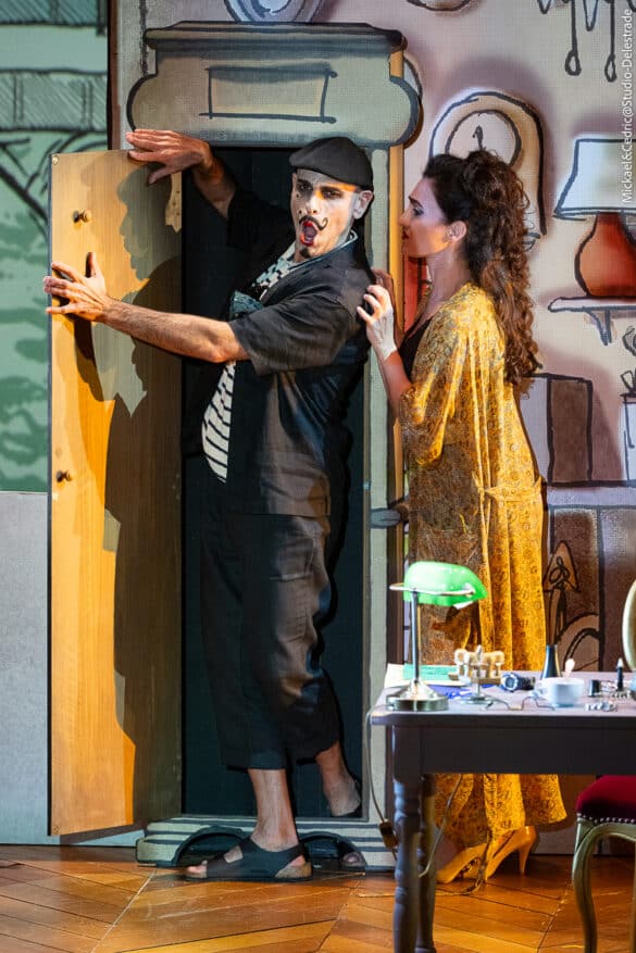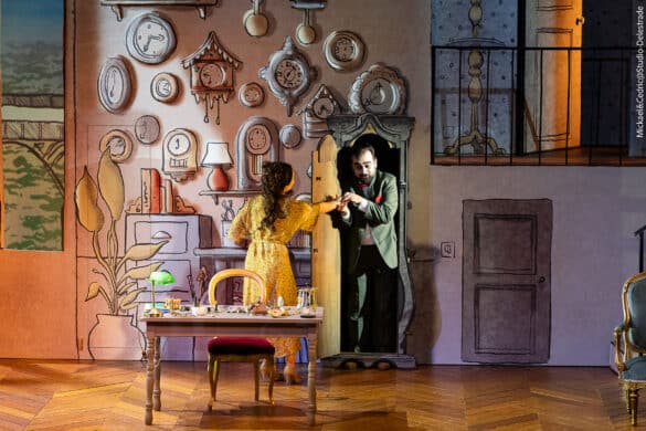 La mise en scène de Jean-Louis Grinda, assisté par Vanessa d’Ayral de Sérignac, est ludique et toute en trompe-l’œil, de multiples horloges sont accrochées au mur et dans deux d’entre elles des amants peuvent se cacher. Parmi eux, l’on compte le muletier un peu bourru alias Ramiro, chanté par Ivan Thirion à la voix sonore, retentissante, au timbre fort et assuré comme ses « biceps qui dépassent les concepts ». Le baryton semble davantage prédisposé à un registre dramatique mais dans cet opéra bouffe réinventé, il joue de sa couleur de voix plus sombre et tragique pour endosser le rôle du muletier déménageur d’horloges.