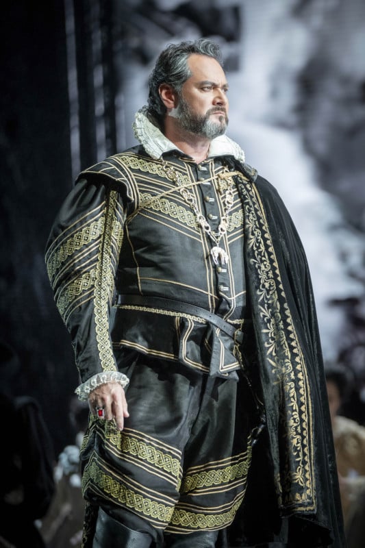 C’est une évidence qu’il convient cependant de toujours garder à l’esprit : plus que tout autre, le chant verdien – a fortiori celui de la maturité – est probablement celui qui requiert le plus d’exigence stylistique de la part de ses interprètes. Il convient déjà de le mesurer par la pertinence harmonique des cinq voix retenues pour les députés flamands auxquelles reviennent, rien moins, que d’exposer, avant le grand concertato de l’acte II, l’un des thèmes les plus émouvants de la partition. Un grand bravo à eux ! Si Madison Nonoa ne nous a pas pleinement convaincu de son adéquation avec l’émission angelicata nécessitée par les quelques phrases, ô combien périlleuses, de la voix du ciel, le page Tebaldo de Mirjam Mesak, à la projection adéquate, répond aux exigences de fraîcheur espiègle de l’emploi. Mention toute particulière, en outre, pour la très sonore intervention du héraut royal de Vincent Di Nocera ! Du moine de Giorgi Manoshvili– remplaçant de dernière minute -, au grave sonore jusqu’au Grand Inquisiteur d’Alexey Tikhomirov, à l’aplomb vocal toujours aussi étonnant – mais court d’aigu -, l’autorité ecclésiastique est bien assurée et devrait faire trembler le pouvoir temporel ! Ce serait sans compter celui que l’on pourrait surnommer – en d’autres temps – le tsar Ildar : en effet, dans son manteau royal et ses autres costumes- tous aussi superbes les uns que les autres – la basse russe Ildar Abdrazakov en impose non seulement scéniquement mais, évidemment, vocalement, dans un rôle dont il est devenu l’un des meilleurs interprètes au monde. Alors, avouons-le : rien que pour un « Ella giammai m’amò » aussi bouleversant à la fois de puissance et de retenue, le voyage en Principauté valait le déplacement !