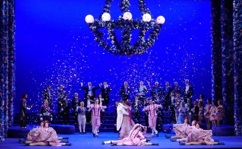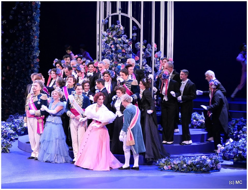 Dans cette production de La Veuve Joyeuse, on cherchera en vain un pourtant salutaire toilettage du livret français – adapté en 1909 de l’original, signé Victor Léon et Leo Stein, par Robert de Flers et Gaston de Caillavet – ou une quelconque réinscription de la trame dans le monde actuel : l’important est davantage, ici, dans la mise en lumières – créées par Michel Theuil – de visages et d’expressions rappelant, à l’occasion, celles des premières versions filmées de La Veuve – ou plus exactement de The Merry Widow – et dans la déclinaison, jusqu’à satiété, de la couleur bleue et de la couleur rose ! Au final, pourtant, ce qui demeure du spectacle, c’est ce charme indéfinissable qui fait que cette musique  continue à nous parler de ce laissez-vivre qui a assuré son succès mondial depuis plus d’un siècle…