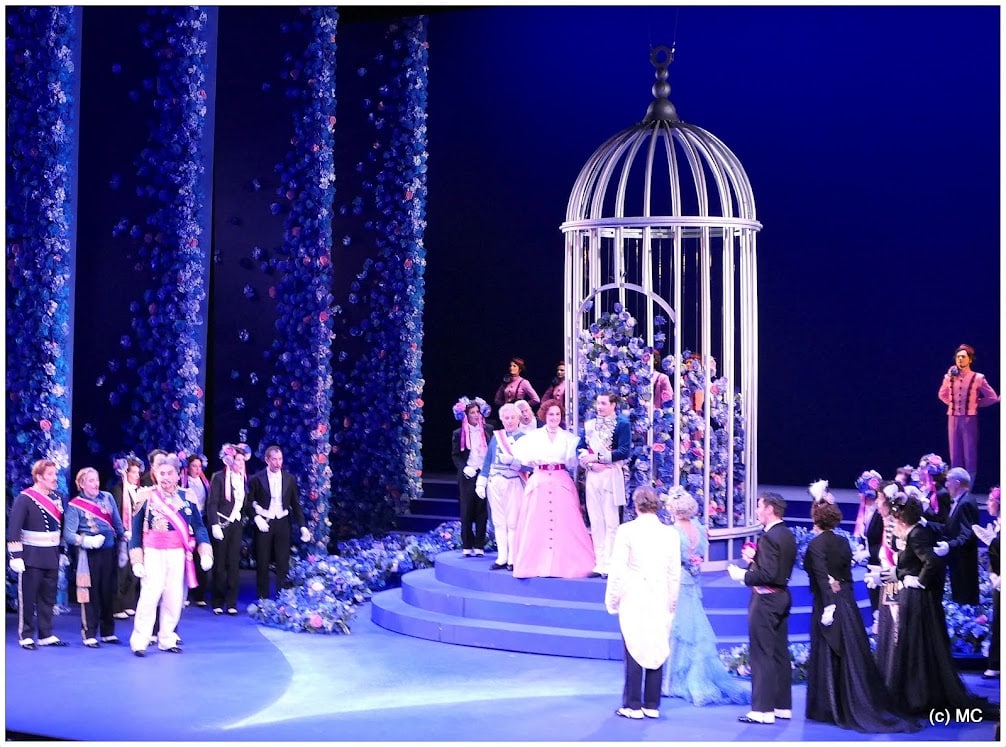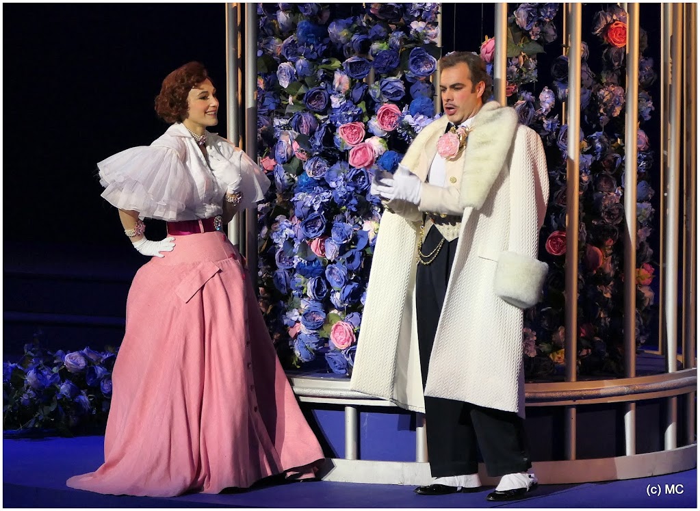 D’emblée, le parti pris est annoncé : le thème du célébrissime duo « Heure exquise », joué en guise d’ouverture et fonctionnant comme le leitmotiv nostalgique d’un Monde d’hier, sera le fil conducteur de la soirée et accompagnera la mise en scène de Jean-Louis Pichon en situant l’intrigue d’origine de la comédie de Meilhac, L’Attaché d’ambassade, dans un environnement technicolor bichrome, ruisselant de bleu et de rose. On est bien ici dans les codes de l’opérette viennoise où les jeux de l’amour sont pléthoriques et où, apparaissant sous un kitschissime cœur percé de plusieurs flèches, Missia Palmieri descendra le « grand » escalier, encadrée par des grooms de grand hôtel – en livrée rose, comme il se doit ici ! – qui, au finale du deuxième acte, se joindront aux autres joyeux compagnons de Marsovie pour faire des cœurs avec leurs mains ! Plus tard, c’est dans un imposant pavillon-cage aux oiseaux (!) entouré de roses multicolores que viendront s’enfermer le séduisant Camille de Coutançon et la volage mais pourtant toujours fidèle (!) Nadia, bientôt remplacée par Missia…