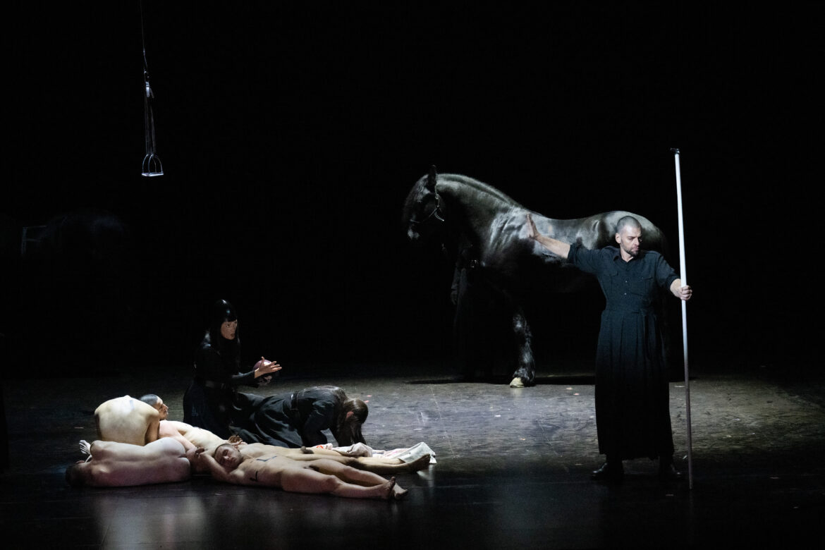 Déjà présente lors du prologue par le biais de deux énormes crocodiles, Roméo Castellucci met en avant l’animalité des personnages. Hunding est associé à un chien noir qui l’accompagne et déambule,  suspicieux, inspectant de son flair chacun des meubles de sa demeure. Ce chien se retrouve pendu à la fin de l’acte II dès lors que Wotan balaye l’époux vengé d’un revers de la main. Fricka, déesse protectrice du mariage et garante de la tradition, abrite dans son costume une quinzaine de colombes qui prendront successivement leur envol. Par un ingénieux subterfuge,  elle déposera un volatile mort sur le perchoir, allégorie de la lance brisée de Wotan, symbole des lois et des traités – une scène emblématique de la finitude des dieux et annonciatrice de leur prochain crépuscule. L’entrée progressive de sa famille dans la marche du destin apparait ainsi clairement matérialisée. Les Walkyries sont quant à elles accompagnées pendant la totalité du premier tableau de l’acte III par huit sublimes chevaux noirs au port altier. Les sauvages et indomptables guerrières, mi-femme mi-animales, hurlent leur cri de ralliement face à leur montures imperturbables comme le ferait une meute pour se retrouver. Chargées de constituer une armée pour défendre les dieux, elles amoncellent les corps nus des hommes sélectionnés puis portés par les chevaux dans un ballet incessant. La présence des animaux, associée à une direction d’acteur précise, manifeste l’expression primaire des passions instinctives des protagonistes.