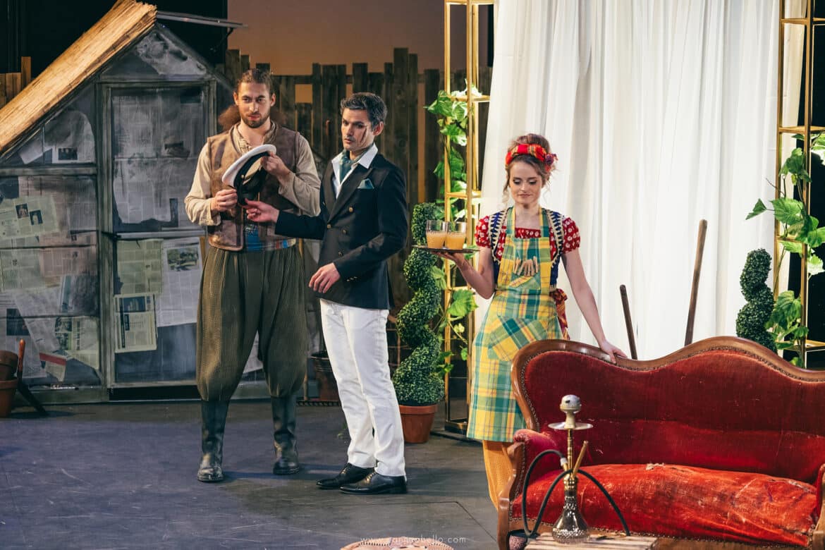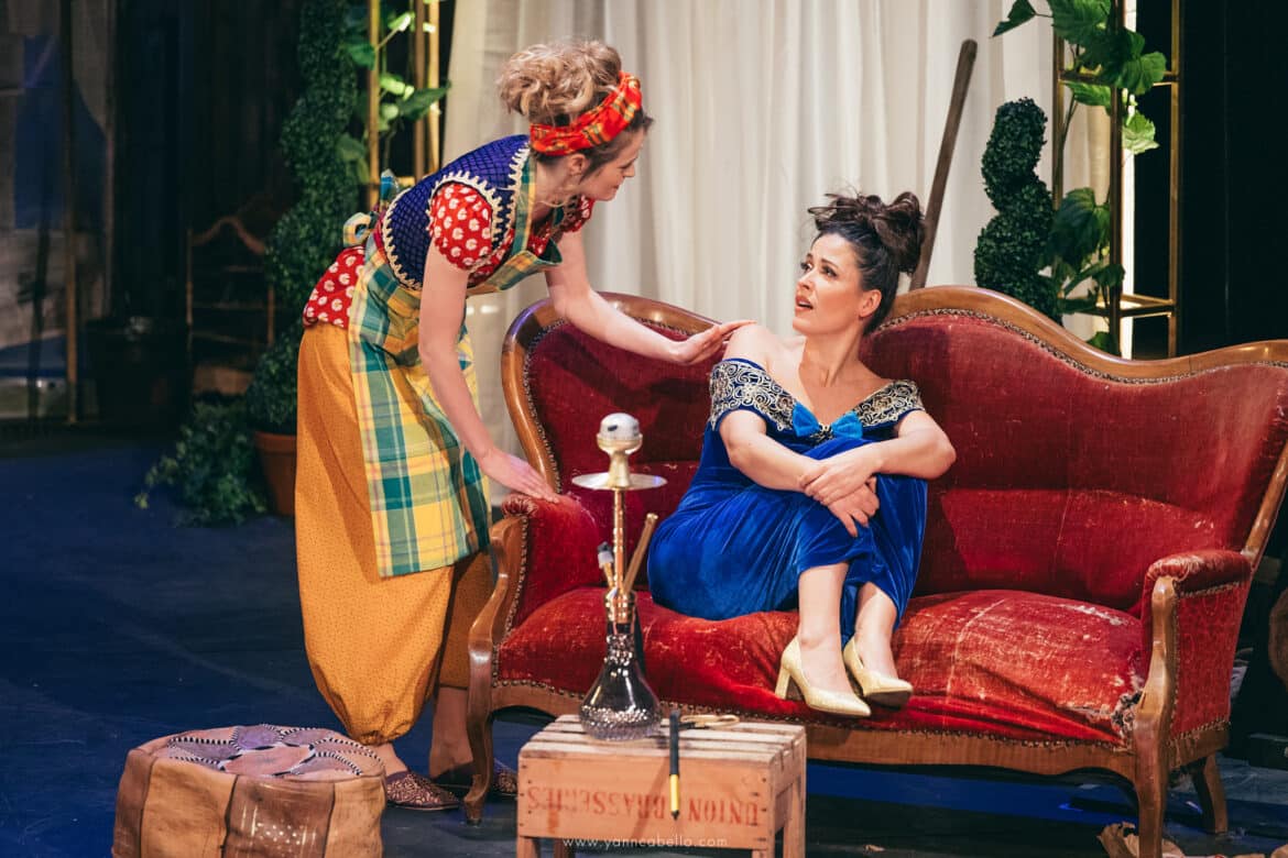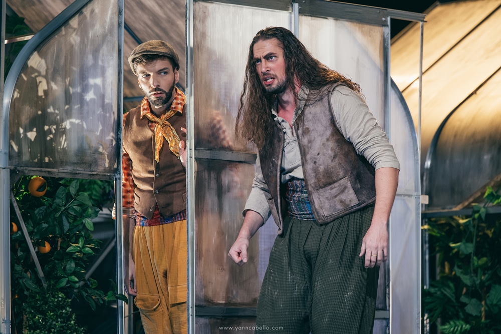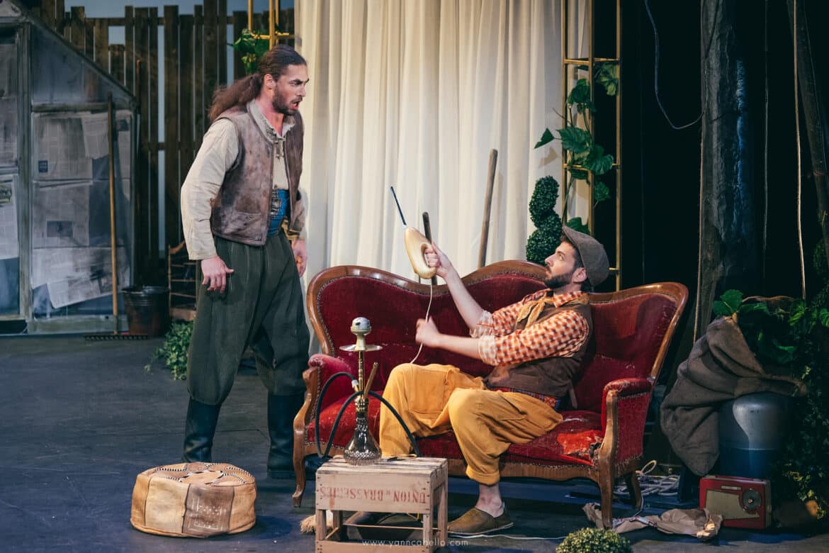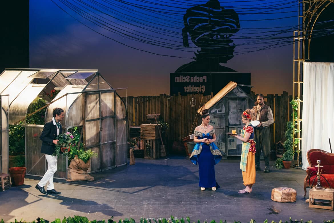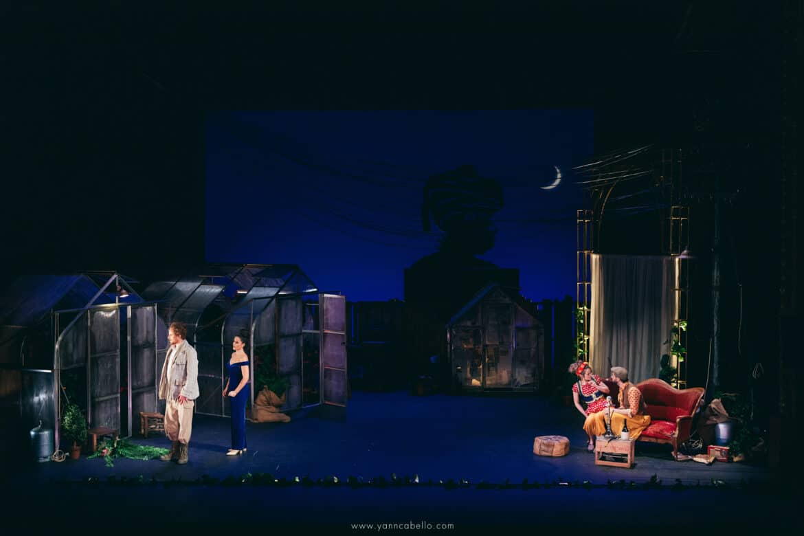 De la turquerie, la dramaturgie du spectacle ne garde donc que quelques touches discrètes essentiellement limitées au vestiaire de Blondchen et Pedrillo chaussés de babouches et vêtus d’étoffes chamarrées marchandées dans le dédale du Grand Bazar. La silhouette d’une enseigne à l’effigie d’une tête de Turc, coiffée d’un tarbouche, ancre l’action à Istanbul ou à Izmir au mitan du XXème siècle mais on chercherait en vain dans le décor d’Amélie Kiritzé-Topor une quelconque référence à l’orientalisme bon teint de la Belle Époque. Le rideau se lève en effet sur l’arrière-cour d’une jardinerie encombrée de serres brinquebalantes et séparée du port par une palissade de guingois qu’il n’est pas bien difficile d’escalader. Un amoncellement de pots, d’outils et de bidons forment un sympathique désordre tandis qu’un vieux divan et un kilim défraichi créent l’illusion d’un boudoir de harem.