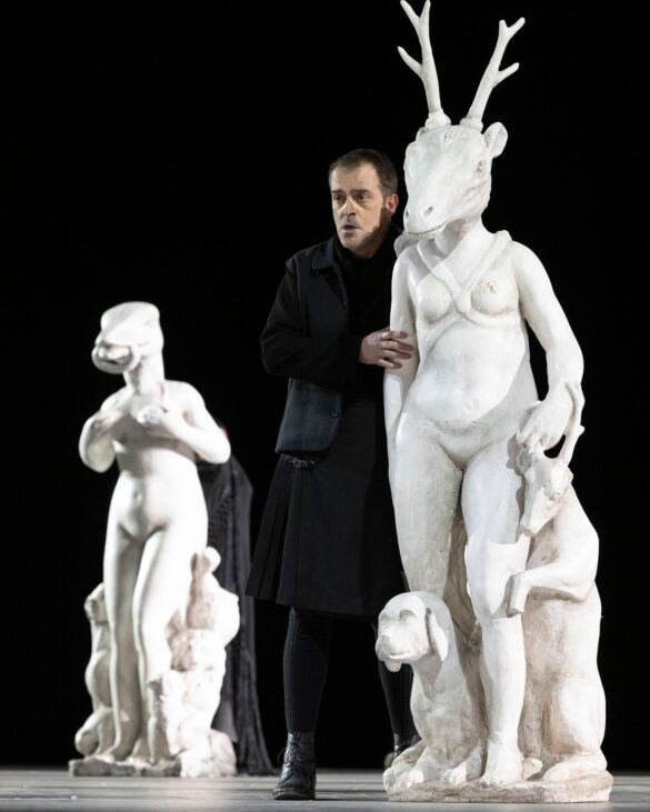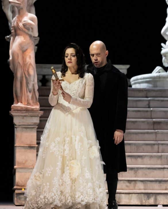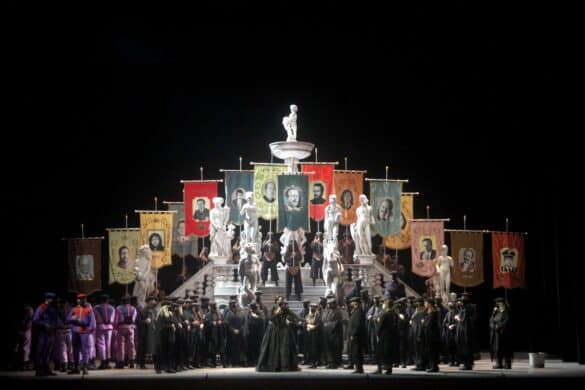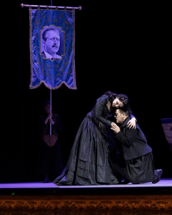 A la question : « Pour comprendre la mise en scène d’Emma Dante faut-il connaître l’histoire contemporaine de l’Italie ? », la réponse est donc : « Non… mais c’est mieux tout de même ! ». En effet, ce serait faire injure à la célèbre metteuse en scène et cinéaste sicilienne – mais également romancière ! – que de ne pas d’emblée relever la maitrise du rythme qui caractérise souvent ses réalisations : de fait, la reprise de sa mise en scène palermitaine des Vespri siciliani – dans sa version italienne cette fois-ci, et donc sans les ballets – nous permet de constater à nouveau combien son travail avec les artistes d’un ouvrage lyrique est influencé par sa vision du théâtre parlé. On reste, en particulier, saisi par la manière dont Emma Dante sait faire bouger le collectif – chœur, danseurs figurants, solistes – dans toutes les scènes situées autour de la fontaine de la place Pretoria de Palerme – magnifiquement reconstruite par le scénographe Carmine Maringola qui confère aux statues baroques des apparences zoomorphistes – et par cette direction d’acteurs limpide qui donne clairement à voir les deux communautés des oppresseurs et des oppressés se faire face, s’affronter, se mêler, se massacrer, tout au long de l’ouvrage, au sein d’un même espace. De même, dans les scènes plus intimistes qui montrent le trio Elena-Arrigo-Procida ou le duo père-fils (Arrigo et Monforte) se déchirer autour des notions de Patrie, de famille, d’amour fraternel ou filial, Emma Dante va à l’essentiel, donnant la priorité à l’instinct des personnages, sans exagération des mouvements. Une sorte d’épure de jeu scénique, proche de la tragédie antique dont Emma Dante met régulièrement en scène les chefs d’œuvres. Comme c’est souvent le cas dans les productions qu’elle signe, la présence de marionnettes traditionnelles siciliennes qui, après avoir été jetées sur la scène comme des sacs poubelles par un mafioso, se mettent soudain à s’animer à la fin de l’ouverture puis se retrouvent aux levers de rideau des actes III et V, fait réagir et bientôt rire la salle, au rythme des duels de chevalerie. Un très beau message de survivance des plus authentiques traditions malgré les humiliations et les pires malheurs. C’est d’ailleurs véhiculé par ce fameux « Opera dei pupi » qu’Emma Dante nous conduit au cœur de la grande originalité de sa vision scénique : une lecture de l’opéra historique de Verdi au prisme des massacres perpétrés par la mafia en 1992, au moment de l’assassinat à l’explosif des juges Giovanni Falcone et Paolo Borsellino. Force est ici de constater que, dans ce niveau spécifique de lecture, le spectateur averti et documenté aura davantage perçu les signifiants qui se déploient sous ses yeux, en particulier lors de la procession des opprimés, avec ses étendards aux portraits des martyrs de 1992 (outre Falcone et Borsellino, on y reconnaît le général dalla Chiesa, le policier Boris Giuliano, le journaliste Pippo Fava…) conduite par Elena, assimilée ici, à la fois, à Rita Borsellino, la sœur à la volonté inébranlable du juge assassiné et, dans une actualité toute récente, à Elena Cecchettin qui a fait du sauvage assassinat de sa sœur par son petit ami, un symbole politique des violences conjugales. Avec ce fond historique contemporain, l’affrontement entre la duchesse Elena et Monforte – ici l’un des capo de Cosa Nostra – n’en apparaît que plus parlant et nous fait davantage comprendre – surtout à nous, public non italien – la volonté immense du peuple sicilien à s’affranchir du joug de l’oppresseur mafieux[1]. Dans cette production, le proscrit Procida revient dans sa Palerme chérie sur un navire nommé « Rosalia », sainte ayant sauvé Palerme de la peste et c’est probablement canonisée que réapparaît à l’acte IV la jeune Ninetta, dont la statue est désormais portée par la population à travers les rues de la ville et dont on comprend la fin tragique. On ne peut terminer cette description d’une production si riche, sans évoquer, d’une part, la vision dramatique , à l’acte II, de ces jeunes siciliennes se lavant la tête dans des bassines et secouant leurs longues chevelures dans l’air tandis que descendent des cintres les plaques des rues où eurent lieu des assassinats mafieux et, d’autre part, la terrifiante Tarantella des jeunes fiancées dont les amoureux sont progressivement remplacés par des séides de Cosa Nostra qui finissent par les enlever dans leurs robes subitement transformées en sacs poubelles : l’image la plus tragique de ce spectacle.