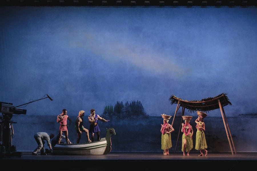 La mise en scène de Bruno Ravella lit l’histoire comme la reprise cinématographique d’un péplum, genre très populaire dans les années 1950 et 1960 : des films en costumes sur des sujets mythologiques ou historiques tournés à Cinecittà par des Américains – Les dix commandements (1959), Spartacus (1960), Cléopâtre (1963)… – et des Italiens, avec des titres dédiés à Hercule, Maciste, Ursus, souvent dans des parodies triviales. Pendant l’ouverture, nous découvrons ainsi que nous sommes sur le plateau d’un tournage avec des projecteurs, des caméras, des micros, un metteur en scène (joué par le même interprète que Polyphème) qui prend certaines libertés avec la jeune actrice (Galatea) – ce qui lui vaudra dans le finale d’être arrêté par la police -, un peintre de décors (Aci), un gymnaste star (Ulysse), l’assistant du metteur en scène, etc.