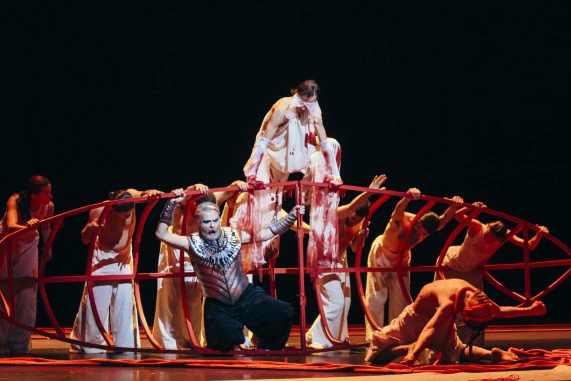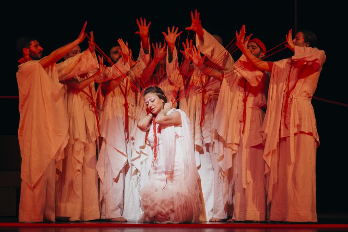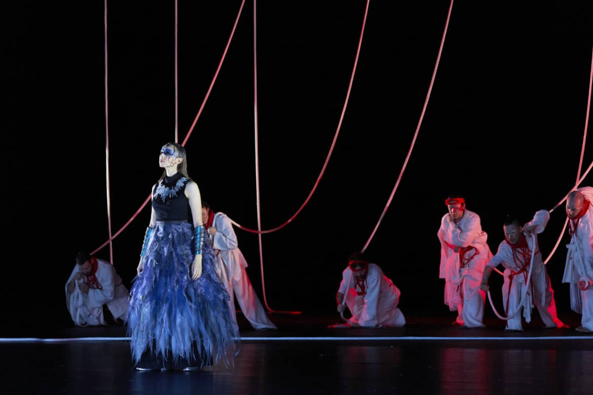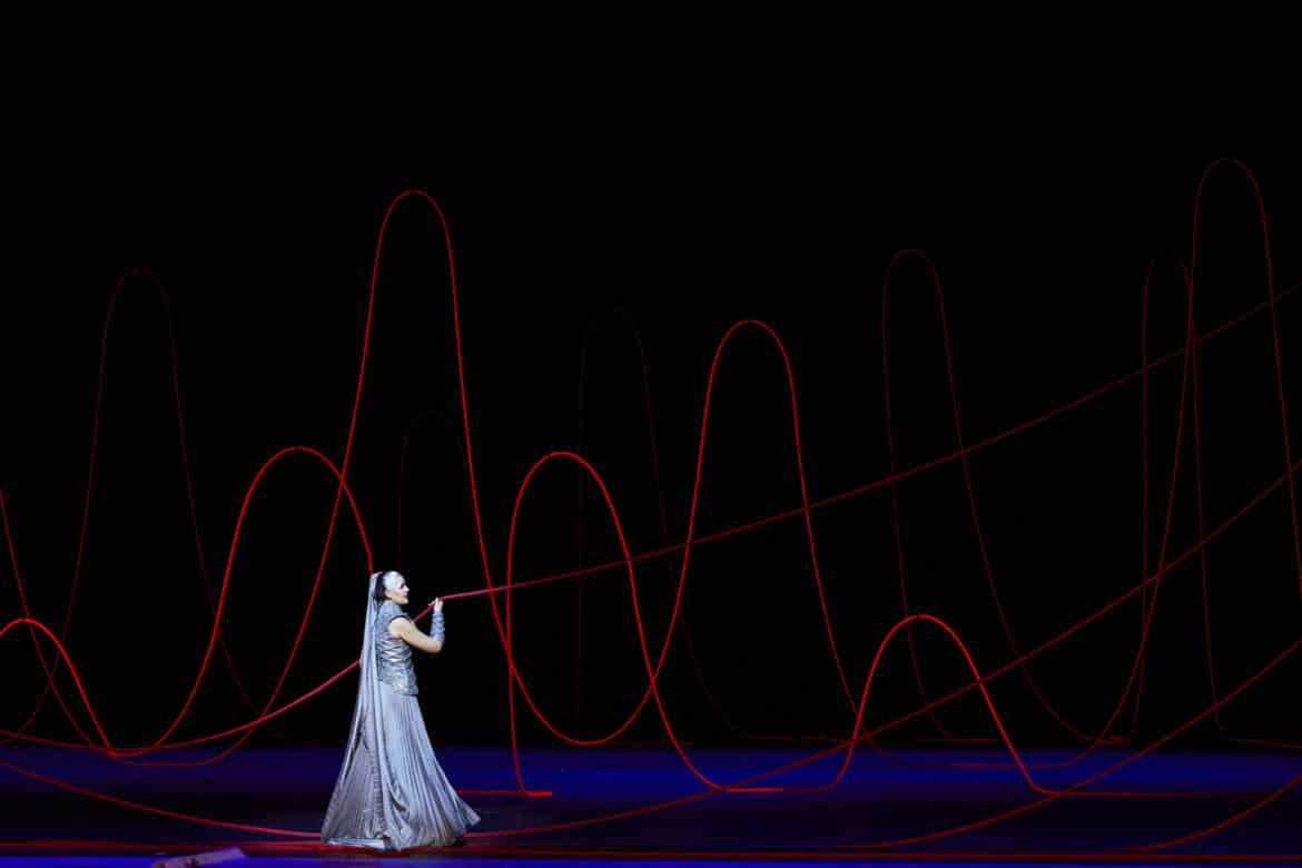 Surprenante époque du polythéisme où chaque dieu se voit responsable d’un drame ou d’une félicité. Le thème classique du serment imprudemment fait à un dieu confère à l’œuvre une tension dramatique des plus efficaces. Cette filiation entre Idoménée et Minos ne sera pas sans conséquence sur la mise en scène et les choix artistique de Chiharu Shiota qui tire et étire à l’excès le fil d’Ariane et y enferme les protagonistes du drame et malheureusement au moment même de performances lyriques.
