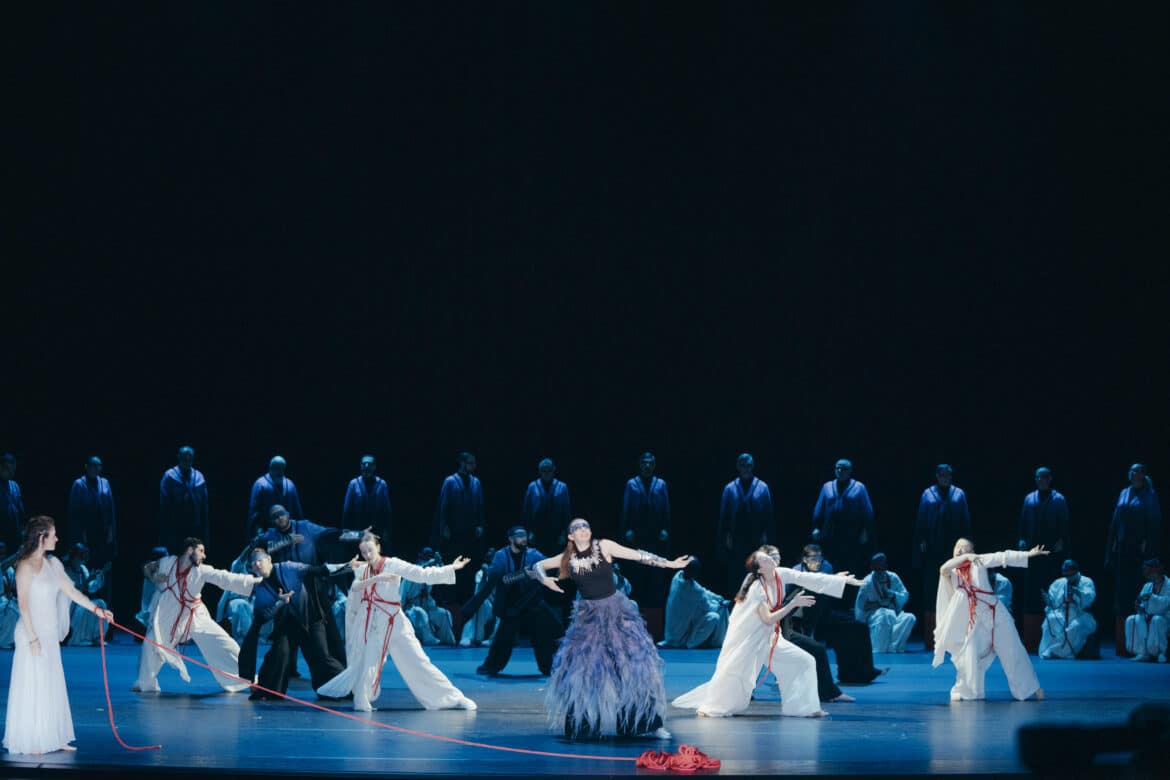 Après Les Indes Galantes de Rameau (2019) et Atys de Lully (2022), le Grand Théâtre de Genève poursuit ainsi son exploration du répertoire de l’opéra-ballet sous la baguette de Leonardo García Alarcón avec cette nouvelle production d’Idomeneo de Mozart. La mise en scène est due à Sidi Larbi Cherkaoui, chorégraphe, metteur en scène et directeur du ballet du Grand Théâtre et la scénographie à Chiharu Shiota, artiste plasticienne japonaise. Les danseurs du Ballet du Grand Théâtre sont accompagnés par la compagnie Eastman. Yuima Nakazato offre ses costumes, à la fois traditionnels et futuristes, qu’elle envisage comme mêlant la Grèce et le Japon.