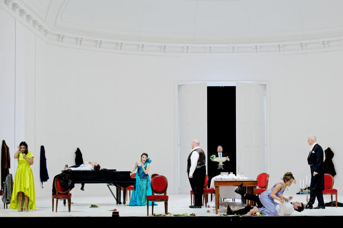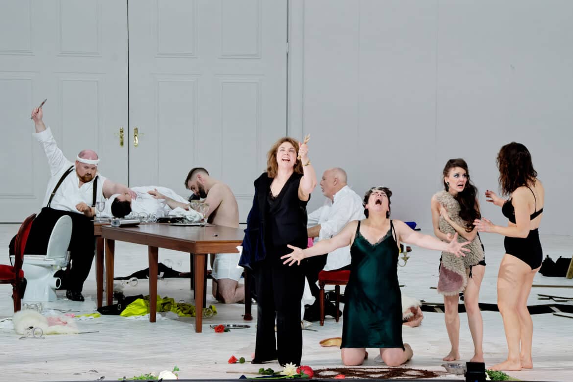 Décrivant son approche du film de Buñuel, Adès explique avoir été frappé par sa ressemblance avec une opérette, mais une opérette horrifique. Ravel avait son Heure espagnole, Adès invente l’« horreurette » mexicaine. Qu’on ne s’y trompe pas, pourtant : par l’ampleur de l’orchestre convoqué – auquel s’ajoutent des ondes Martenot plutôt rares dans la fosse de Bastille – comme par le plateau vocal – quinze chanteuses et chanteurs en permanence sur scène pendant deux heures -, l’œuvre d’Adès se présente comme un opéra ambitieux, exigeant, parfois aride. Par ses motifs concentriques obsessionnels tout en glissandi, ses lignes de chant tendues, sa dislocation progressive des formes (la sonate jouée au piano pour divertir les convives, les pirouettes vocales de la diva, les valses fantomatiques et les rythmes processionnels tournant peu à peu à vide), la musique parvient à communiquer aux spectateurs/auditeurs une impression prégnante de claustrophobie. Si l’on rit ou sourit, c’est toujours avec un arrière-goût d’angoisse, tant le spectacle offert par la production de Calixto Bieito souligne la déliquescence sans retour de cet échantillon d’humanité traversé, tiraillé, tourmenté par des pulsions et des désirs contradictoires. Dans le vaste salon des Nobile, tout de blancheur moulurée, les quinze personnages deviennent des mobiles colorés dont on observe les trajectoires, les collisions et les implosions avec une curiosité effarée – mais peut-être moins d’empathie que chez Buñuel. Il faut dire que la multitude de drames intimes se jouant sur l’immense plateau finit par se perdre dans l’hystérie générale, scandée par des déferlements orchestraux paroxystiques. Le pendule qui, en chaque personnage, oscille sans cesse du sexe à la mort a ici des airs de wrecking ball… Autre étrangeté, Bieito choisit d’escamoter un des coups de théâtre les plus forts du film : l’assaut du manoir par les forces de police, elles aussi empêchées par la « force invisible », que l’on comprend alors agissante non seulement dans la maison mais aussi au-dehors. Or ici, tout se passe in absentia au début du troisième acte, dans un furtif échange choral en coulisses… Dommage. Dommage aussi que la barrière infranchissable du salon, d’autant plus effrayante chez le cinéaste qu’elle est invisible, soit ici platement figurée par une haute double porte, transformant les personnages et le public en autant de Judith bartokiennes. On ne s’attardera pas sur les fantaisies indéchiffrables ou les motifs d’une modernité déjà vieillotte dont Bieito assaisonne sa lecture (copulation sur un ours en peluche géant, enfant bêlant en regardant ses ballons gonflables en forme de moutons…). Au moins les projections vidéo nous auront-elles été épargnées, fait suffisamment rare pour être mentionné.